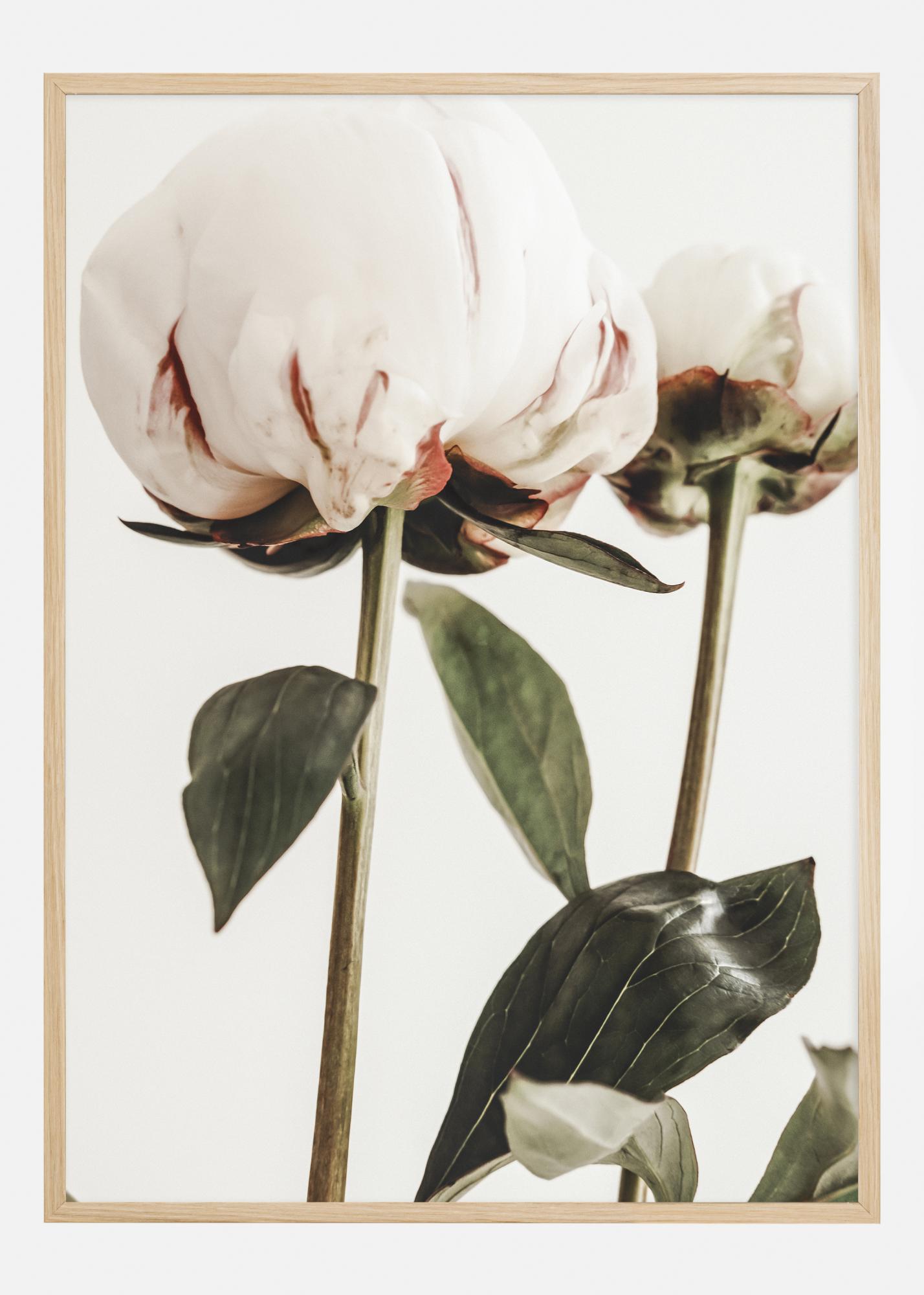 Dieses Poster fängt die außergewöhnliche Schönheit von Pfingstrosen in voller Blüte ein. Die großen, flauschigen Blumen, mit ihren sanft gefalteten Blütenblättern in Schattierungen von Weiß und Rostrot, stehen stolz auf ihren starken Stielen. Die tiefgrünen Blätter bilden einen kraftvollen Hintergrund, der die delikate Struktur und die reichen Farbnuancen der Blumen hervorhebt.