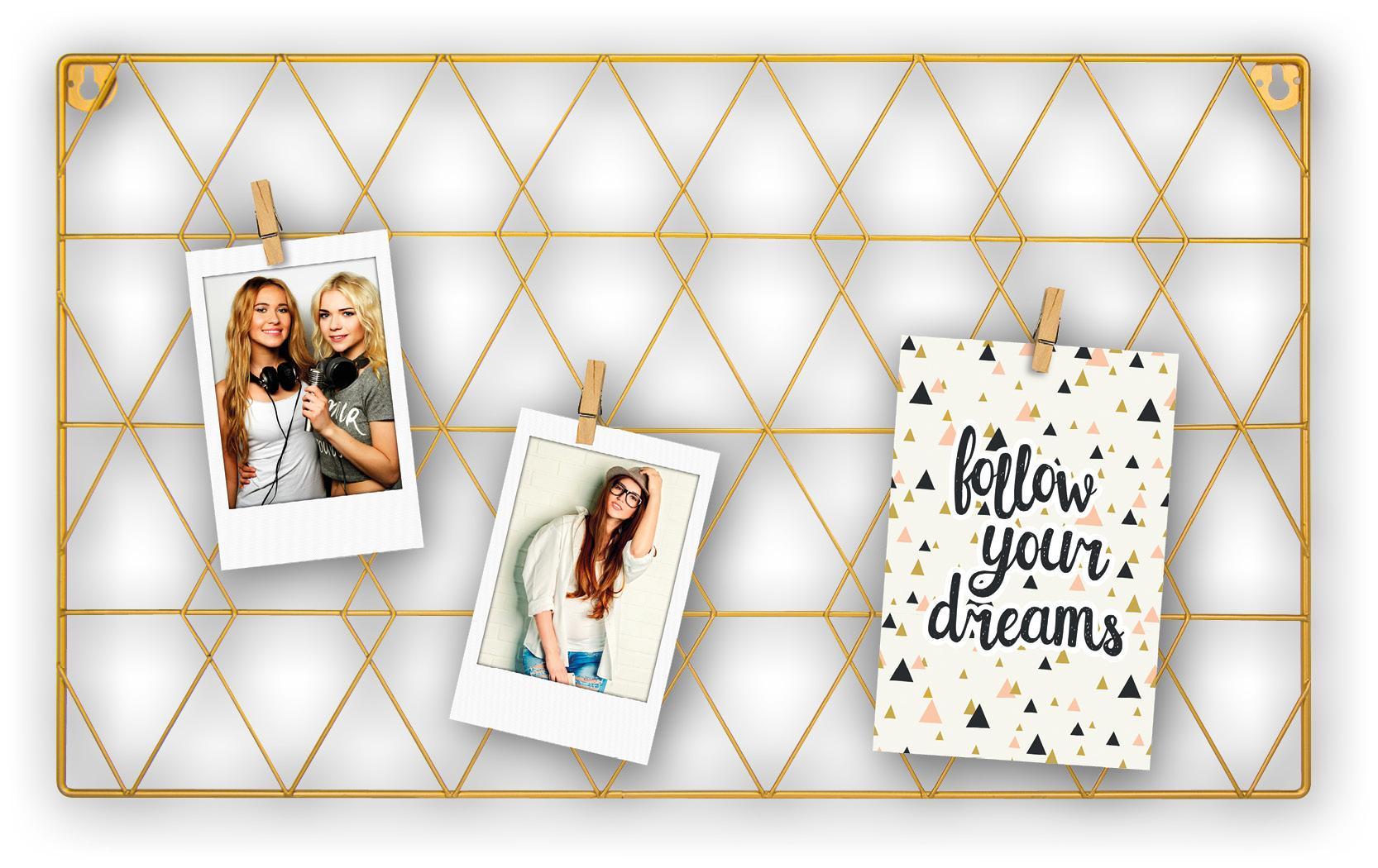 Collagerahmen im Design eines Aushangs, einer Art Pinnwand, erinnert an ein "schwarzes Brett", auf dem Fotos und Bilder mit Clips befestigt werden. Der Bilderrahmen ist aus Metall gefertigt und in einer goldenen Farbnuance gehalten. Da die Bilder mit Hilfe der Clips aufgehängt werden, können verschiedene Bildgrößen und Formate ausgewählt werden, die zusammen eine schöne Bildercollage ergeben. Hier können natürlich auch andere Dinge wie z.B. kleine Zettel, Poster etc. aufgehängt werden. Lass deiner Kreativität freien Lauf! Der Bilderrahmen besitzt die Größe 50x30 cm im Außenmaß. Dieser goldene Bilderrahmen passt beispielsweise wunderbar über den Schreibtisch, in die Küche oder überall da, wo er einen tollen Blickfang ausmacht und seine Funktion voll ausfüllt. Der moderne Collage-Bilderrahmen ist mit einer Wandhalterung versehen. Dieser Bilderrahmen eignet sich auch wunderbar als persönliches Fotogeschenk.
