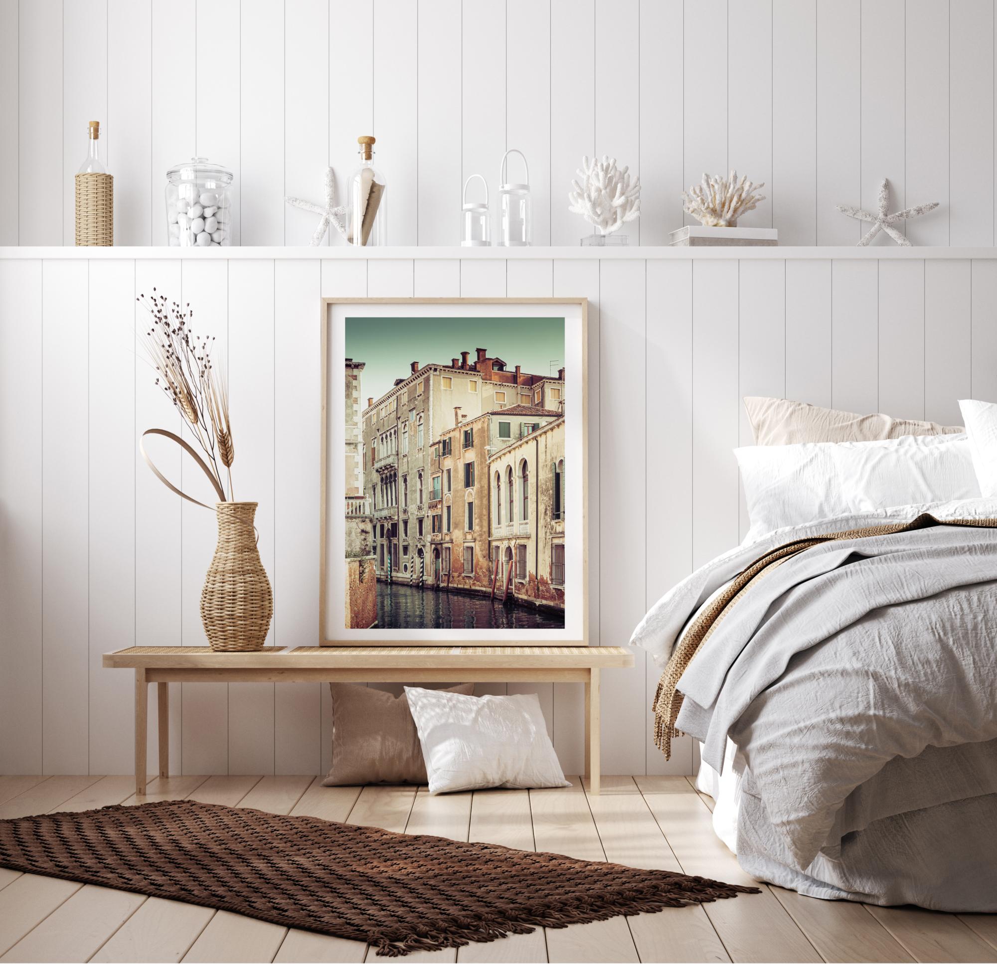Ein Stadtposter einer Kanalstraße in Venedig. Pastellfarbene Töne lassen die Gebäude am Rande des dunkleren Kanals weich erscheinen. Ein sanfter blauer Himmel umrahmt die Häuser darüber. Machen Sie eine Reise in diese atemberaubende Stadt, wenn Sie dieses Poster zu Hause aufhängen.
