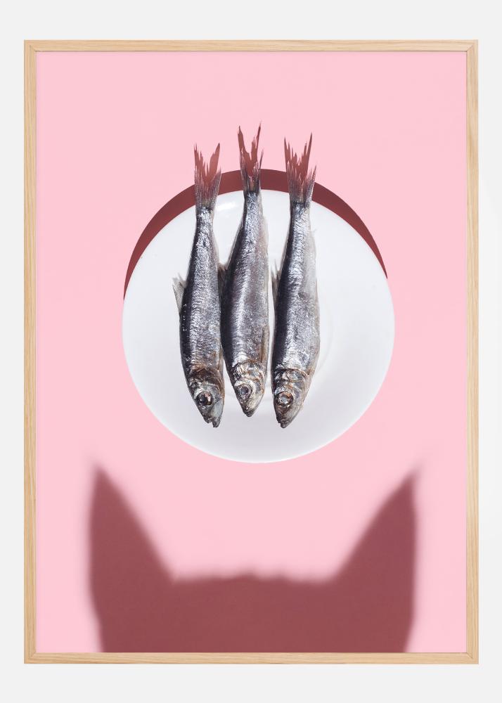 Die dominierenden Farben dieses Drucks sind ein pastellrosa Hintergrund, der mit dem Weiß des Tellers und dem silbergrau der Fische harmoniert, was die Textur und Form der visuellen Elemente verstärkt. Das Spiel des Lichts zwischen den Objekten und dem Hintergrund zieht die Aufmerksamkeit des Betrachters auf sich und trägt zu einem dynamischen Gefühl im Bild bei. Dieses Poster ist nicht nur ein Kunstwerk für Feinschmecker und Katzenliebhaber, sondern auch für diejenigen, die die Schönheit der Einfachheit und einen subtilen Hauch von Humor im Innendesign schätzen.