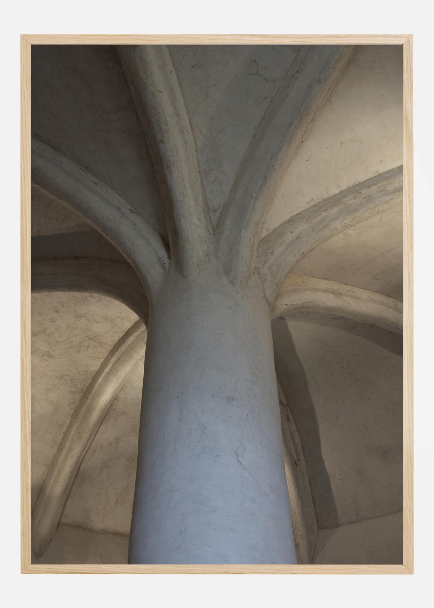 Ein architektonisches Poster des Inneren einer Kapelle oder einer Kirchendecke. In der Mitte steht eine einzelne Säule, die sich bis zur Decke erstreckt, wo sich acht Gewölbe wie eine Blume ausbreiten. Der kühle Stein vermittelt ein Gefühl von Erhabenheit, das Sie auch zu Hause genießen können.