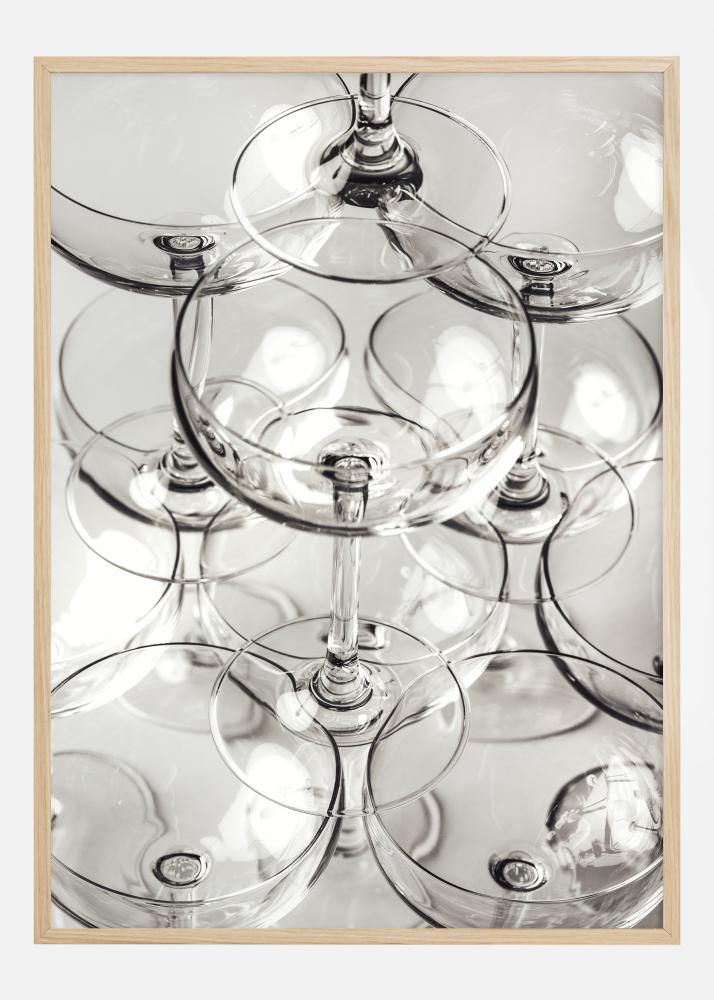 Dieses elegante und anspruchsvolle Poster fängt die Schönheit und Klarheit eines Kaskaden von Champagnergläsern ein. Das Bild zeigt eine Nahaufnahme der komplexen Struktur des Glases, bei der das Licht reflektiert und durch das transparente Material gebrochen wird, was einen Tanz aus Licht und Schatten schafft. Der Detailreichtum und die filigrane Präzision in der Komposition betonen die zarten Formen der Gläser und die subtilen Nuancen im Glas.