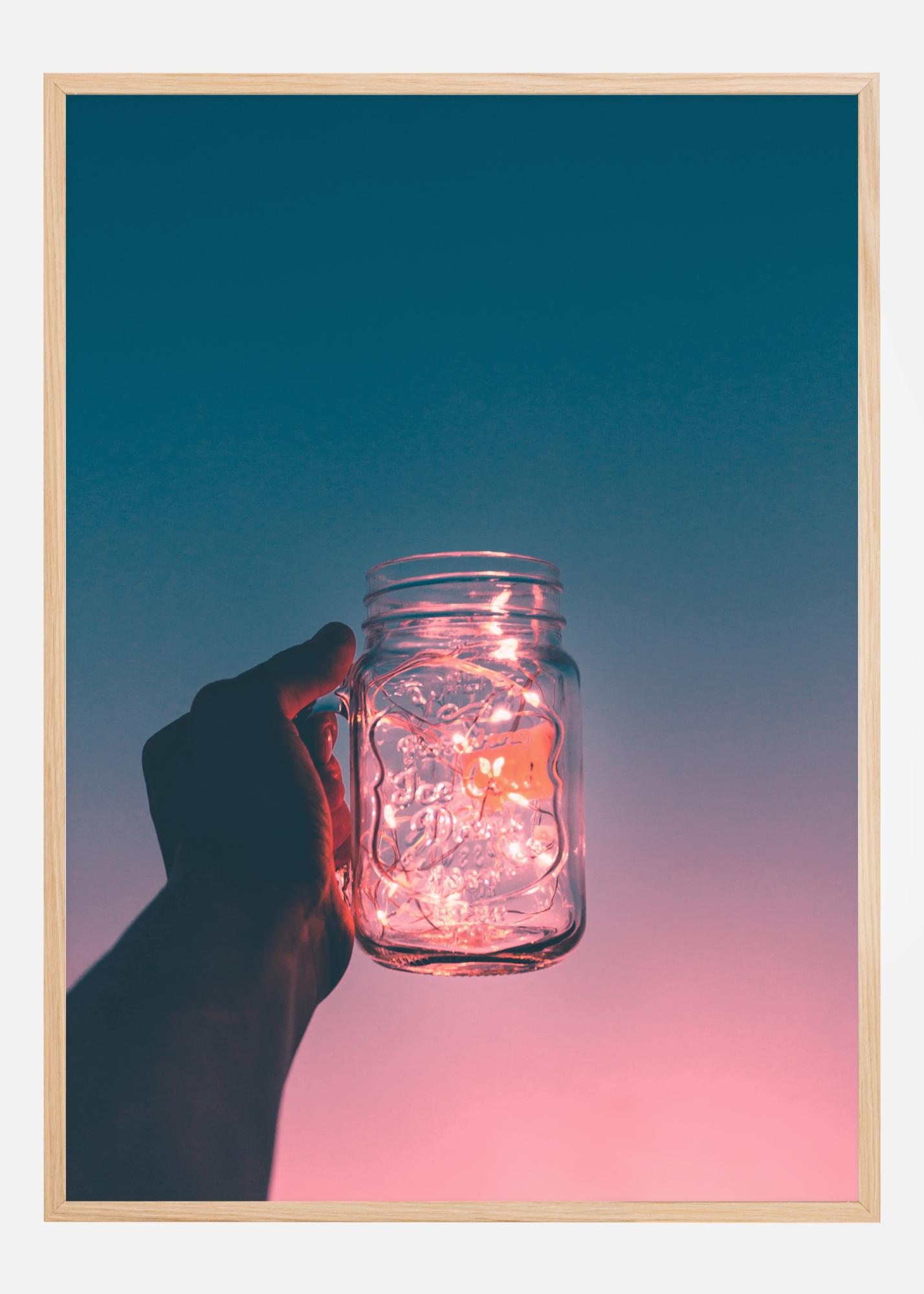 Ein freundliches Poster einer Hand, die einen Einmachglasbecher mit Lichterketten darin hält. Genießen Sie diese magische Stimmung, wie die leuchtenden Lichter in einen weichen blauen und rosa Hintergrund gehoben werden und damit ein echtes Fantasy-Gefühl bringen. Erheben Sie auch Ihr Glas auf dieses Bild und spüren Sie die aufmunternde Stimmung, die dieses Poster verbreitet.