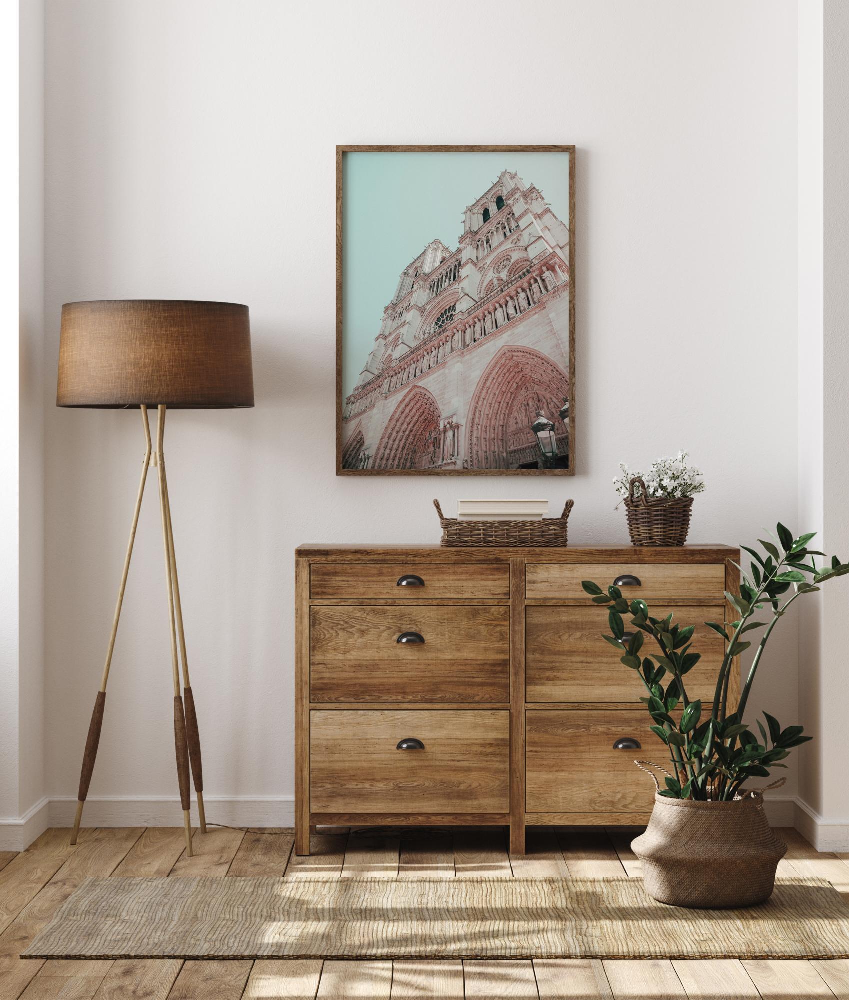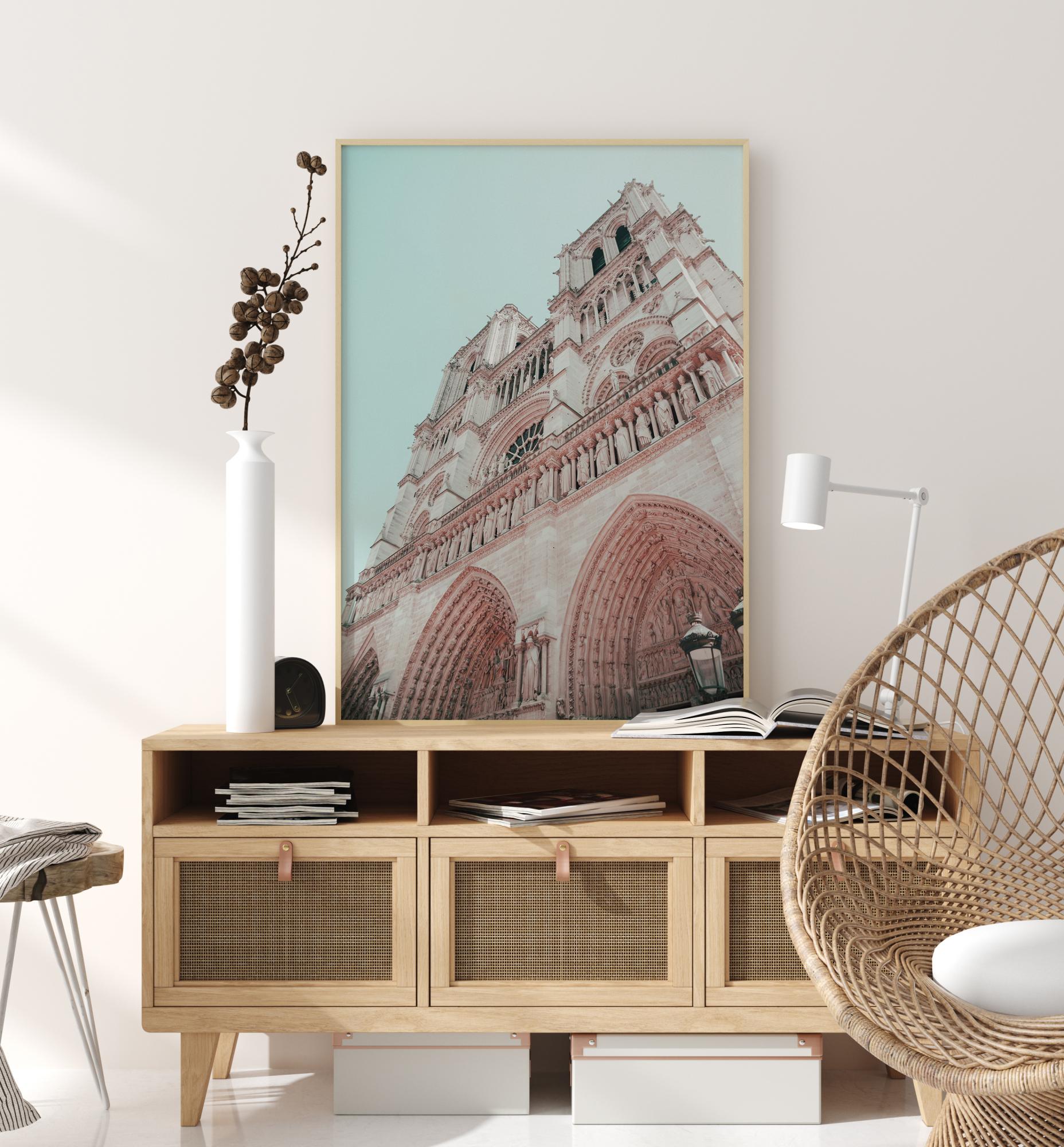 Ein dramatisches Poster der Fassade einer Kirche. Sehen Sie sich dieses weiß-rosa Gebäude mit seinen gotischen Bögen, steinernen Heiligenstatuen und runden Fenstern an. Die sanften Pastelltöne schaffen eine harmonische Atmosphäre, die perfekt ist, um zu Hause eine beruhigende Stimmung zu erzeugen.