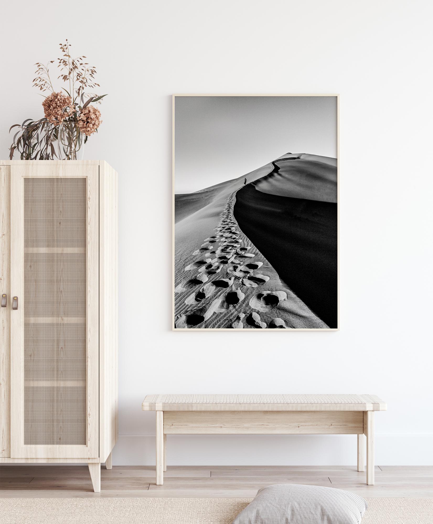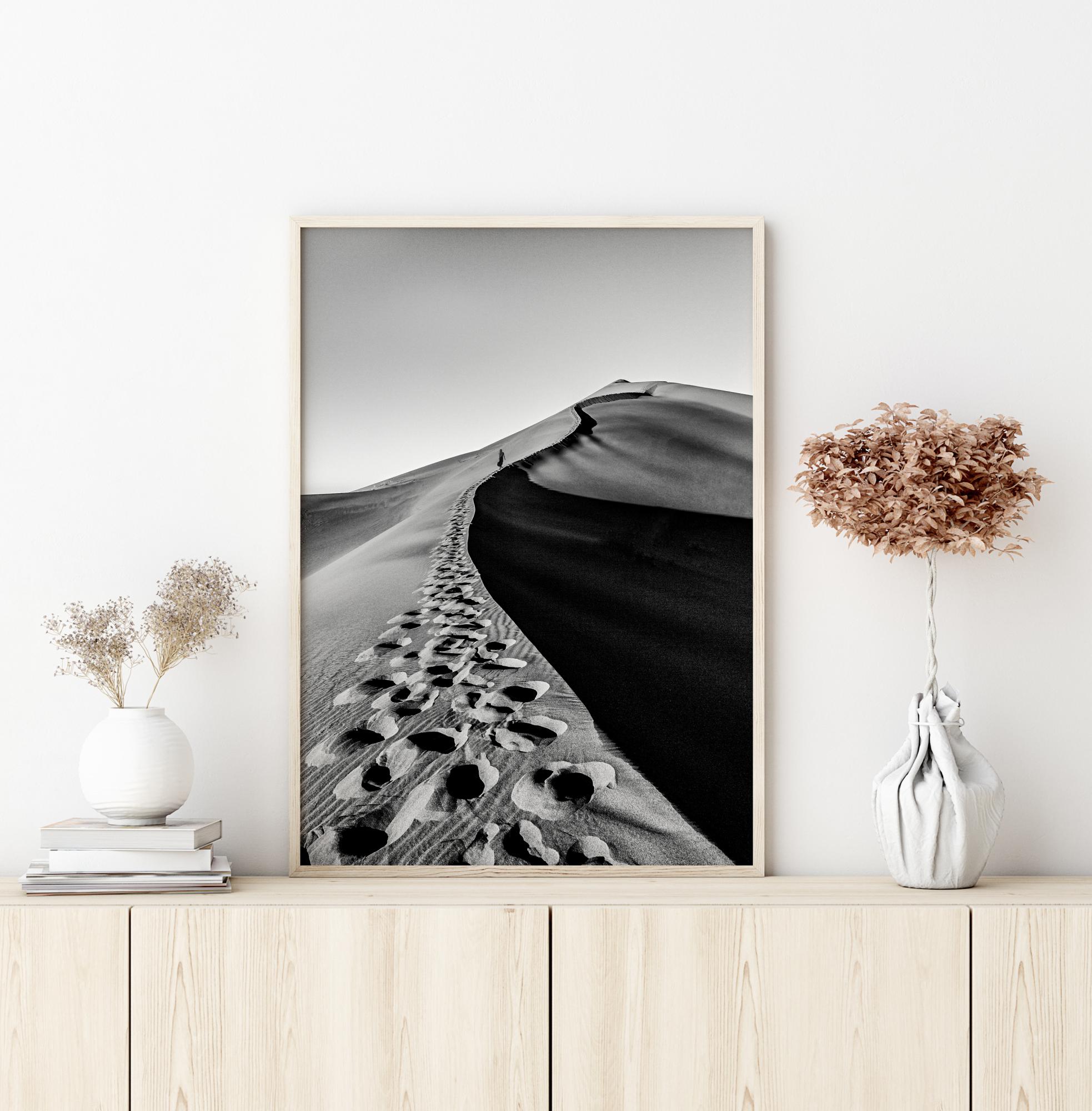 Ein atemberaubendes Poster einer Person, die einen Hügel hinaufsteigt. Der atemberaubende schwarze Pfad wird von den Fußabdrücken im Sand kontrastiert, die den Blick auf eine weit entfernte Figur lenken. Bringen Sie mit dieser Aufnahme Abenteuer in Ihr Zuhause.