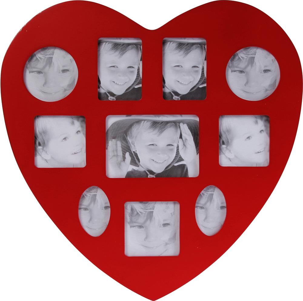 Goldiger roter, herzförmiger Collagerahmen mit Platz für 10 Bilder in unterschiedlichen Größen.
