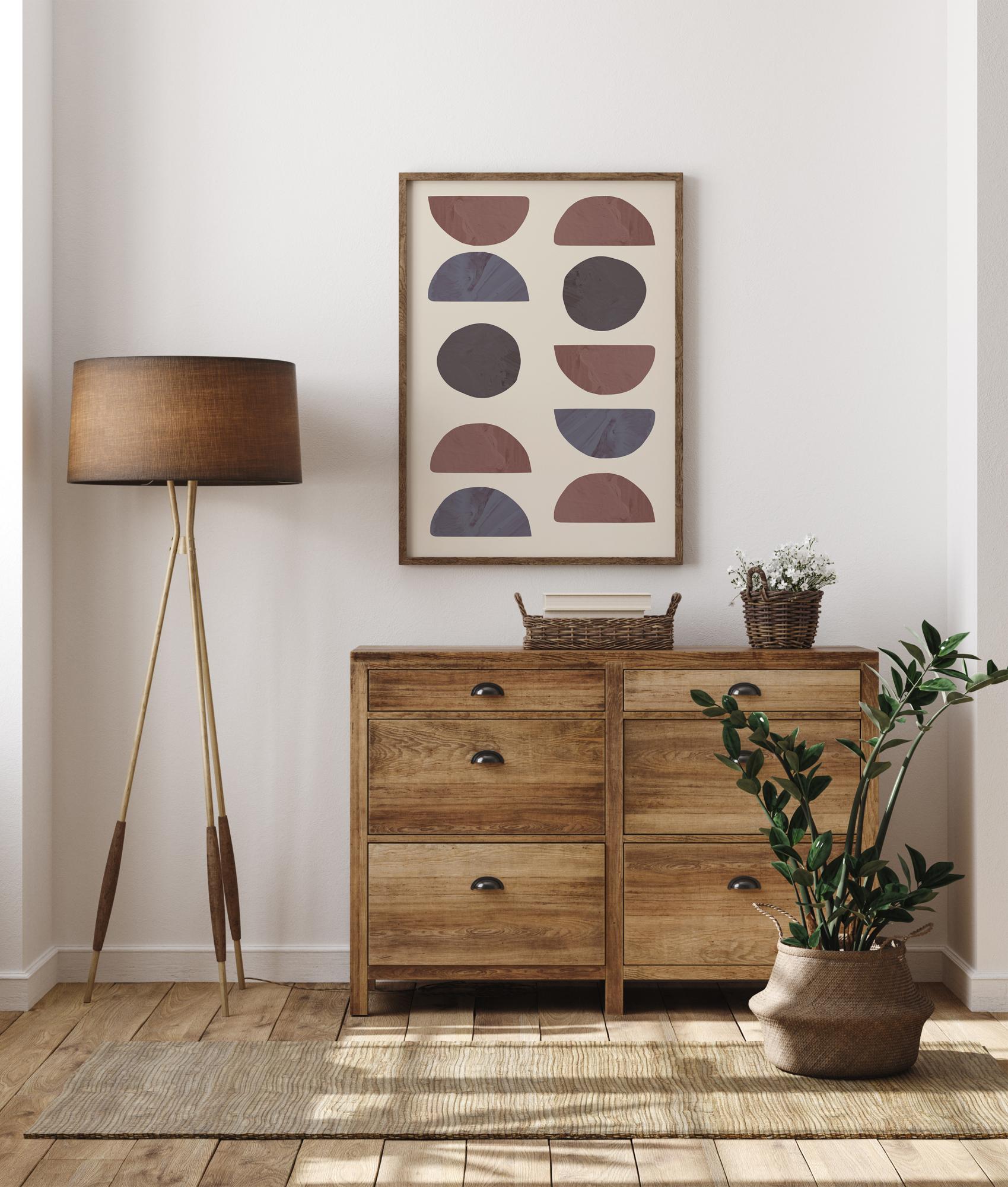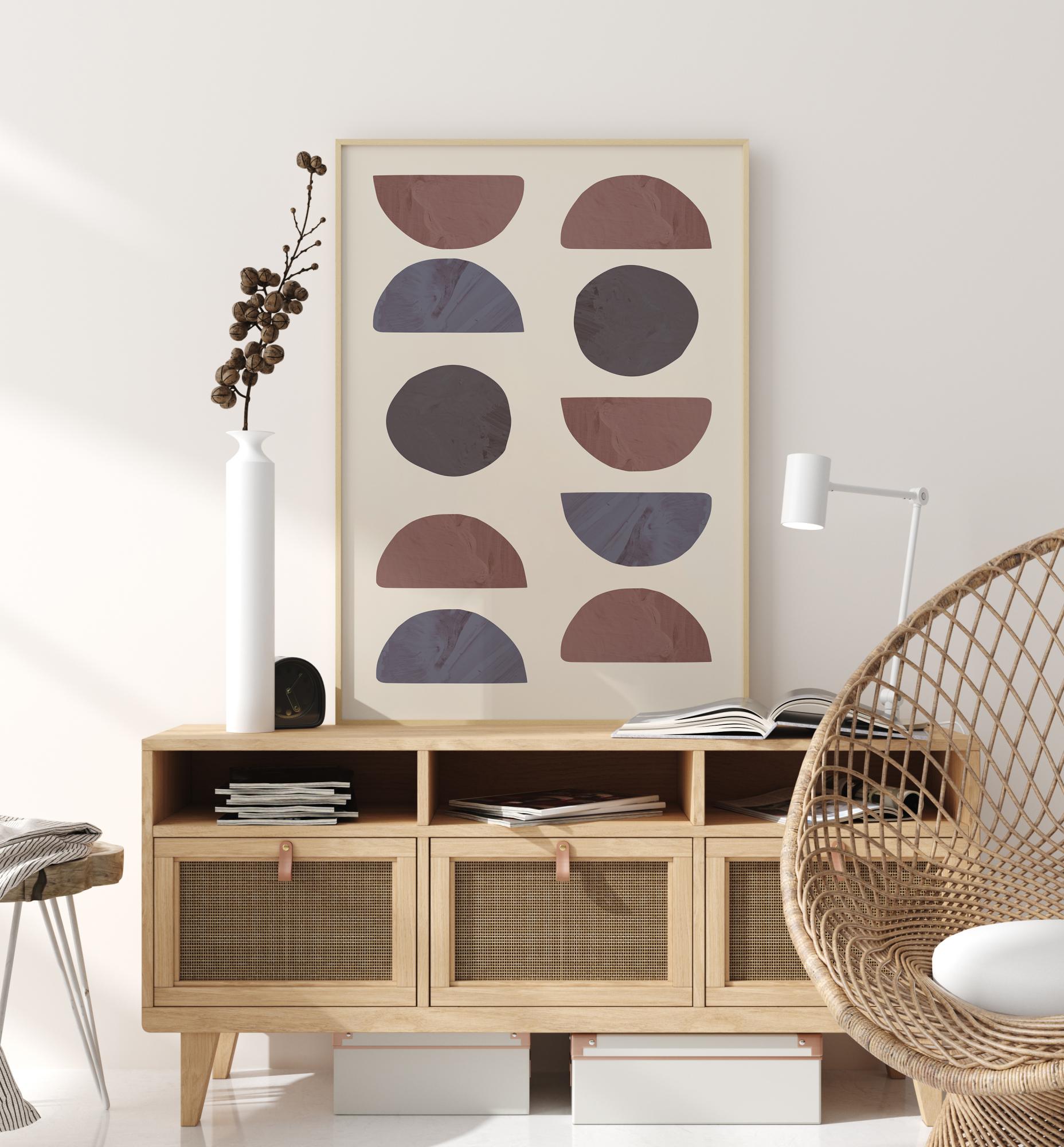Ein abstraktes Poster, das mit verschiedenen Halbkreisen und Kreisformen gefüllt ist. Es gibt zwei Säulen mit verschiedenen Mustern von Kreisen und Halbkreisen, alle in verschiedenen Blau-, Grau- und Rottönen. Verschönern Sie eine schlichte Wand mit diesen geometrischen Formen und sorgen Sie für etwas Spaß im Haus.