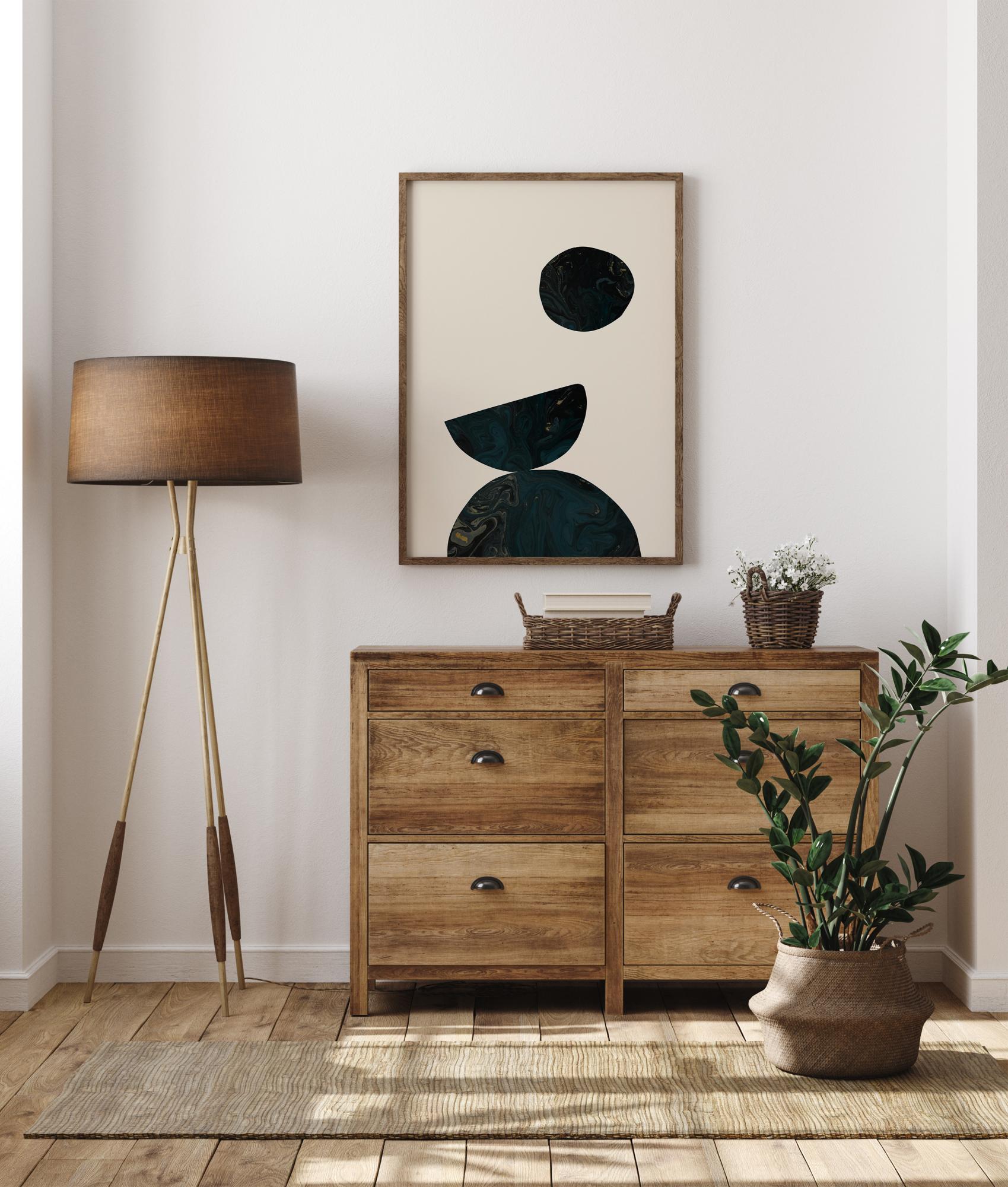 Ein helles Poster mit drei dunkelblauen und schwarzen Formen, die ein faszinierendes Bild ergeben. Ein Halbkreis sitzt am unteren Rand und balanciert einen anderen nach oben gedrehten Halbkreis aus. Darüber schwebt ein schwarzer Kreis auf einem auffälligen weißen Hintergrund. Kombinieren Sie die schönen Marmorwirbel mit einem helleren Farbton an den Wänden, um die Wirkung zu verstärken.