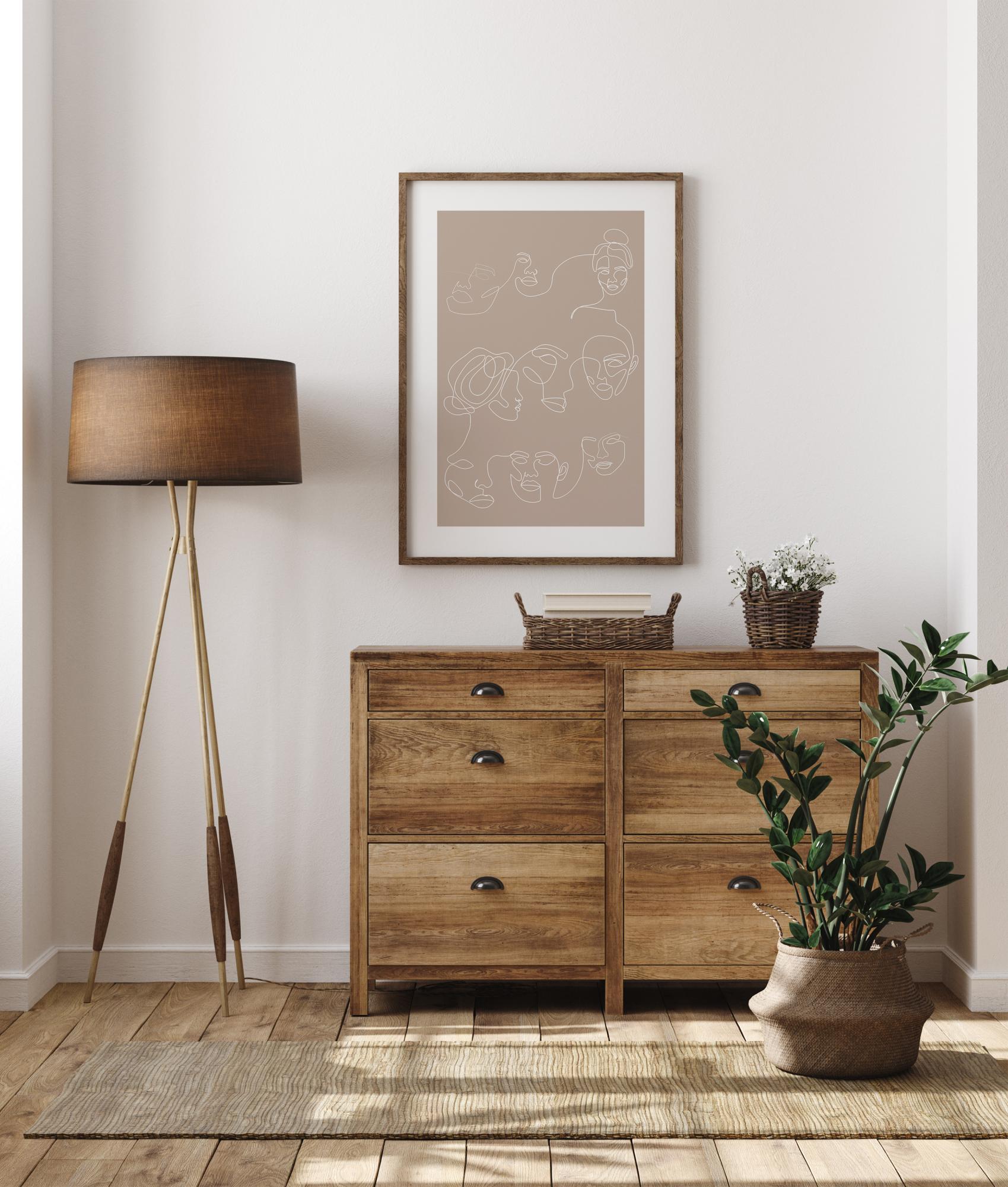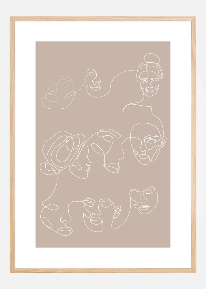 Ein Skizzenbuch-Poster mit einer Reihe verschiedener abstrakt gezeichneter Köpfe und Gesichter. Diese abstrakten Köpfe wurden alle mit einer einzigen Linie gezeichnet, sodass sie alle in einer langen Linie zusammenlaufen. Die weißen Linien auf dem beigefarbenen Hintergrund passen zu jeder Wand mit kräftigen Farben und sorgen für eine künstlerische Ausstrahlung.