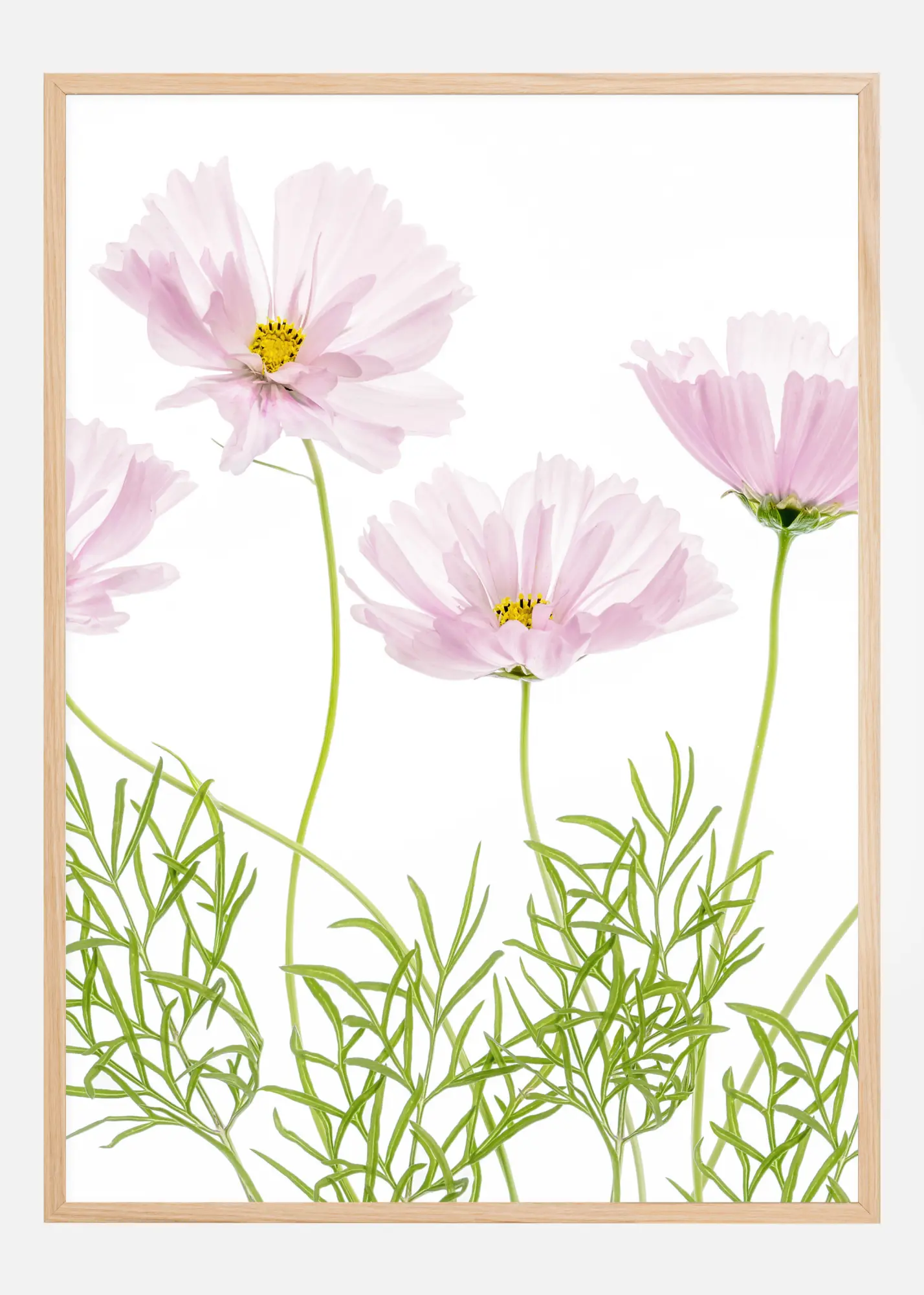 Ein Poster im Druckstil mit Cosmos-Cupcake-Blumen. Jede Blüte ist in einem zarten Lila-Rosa gehalten und hat eine leuchtend gelbe Mitte. Die einfachen grünen Blätter lenken den Blick auf diese tanzenden Blüten. Holen Sie sich diesen wunderbaren Druck in Ihr Zuhause.