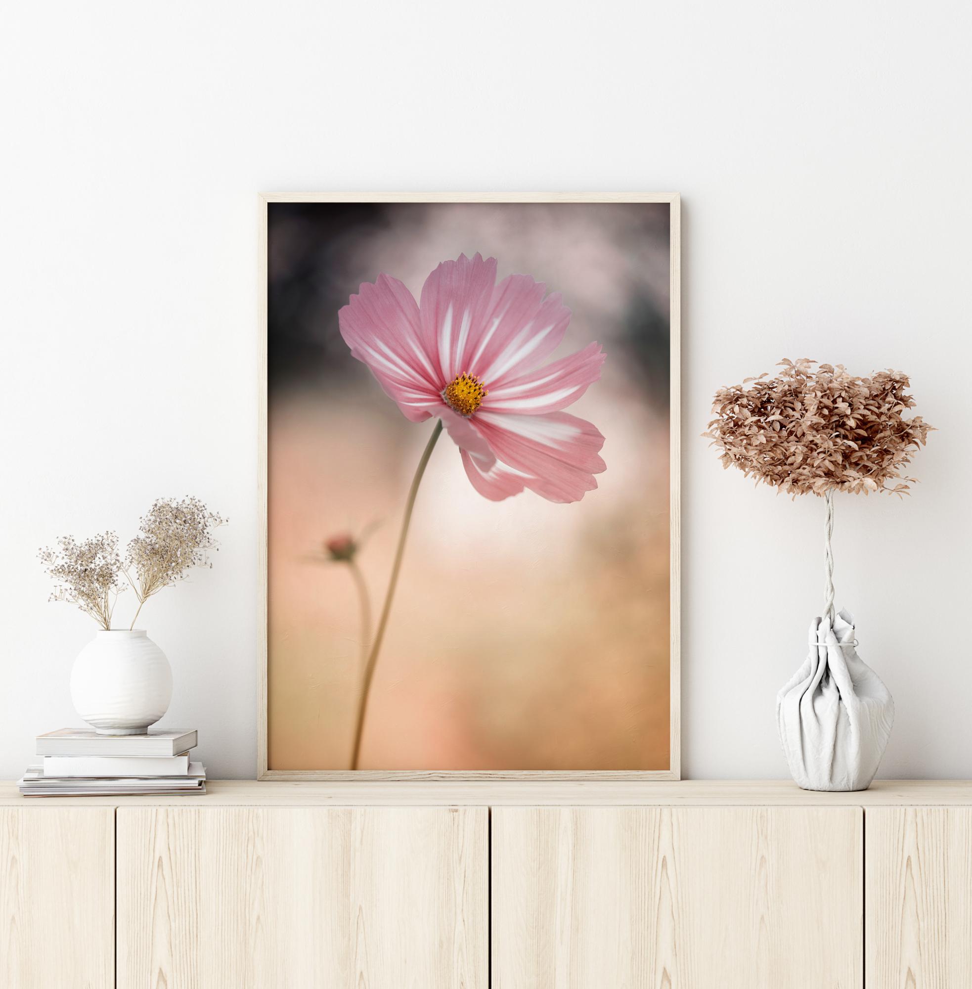 Ein atemberaubendes Poster einer Cosmos-Cupcake-Blume, bei der das Licht durch die Blütenblätter scheint. Das Rosa der Blütenblätter und die gelbe Mitte sind hell mit einem sanften pfirsichfarbenen Hintergrund für Tiefe. Fühlen Sie sich hell und luftig, wenn Sie dieses weiche Pastellbild in Ihrem Zuhause betrachten.