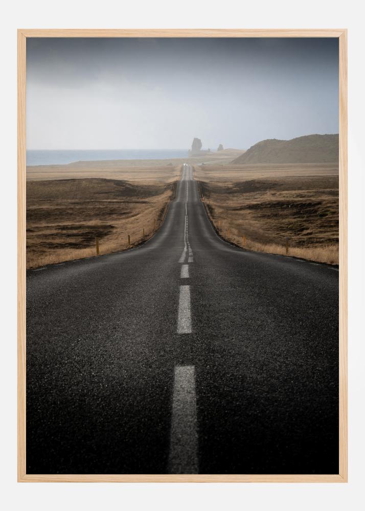 Ein weites Landschaftsposter mit einer Straße, die in die Ferne führt. Eine asphaltierte Straße führt in die Ferne, die weißen Linien markieren den Weg. Zu beiden Seiten liegen braune Felder und in der Ferne das Meer und die Berge. Stellen Sie sich vor, wohin die Straße Sie führen könnte, wenn Sie dies nach Hause bringen.