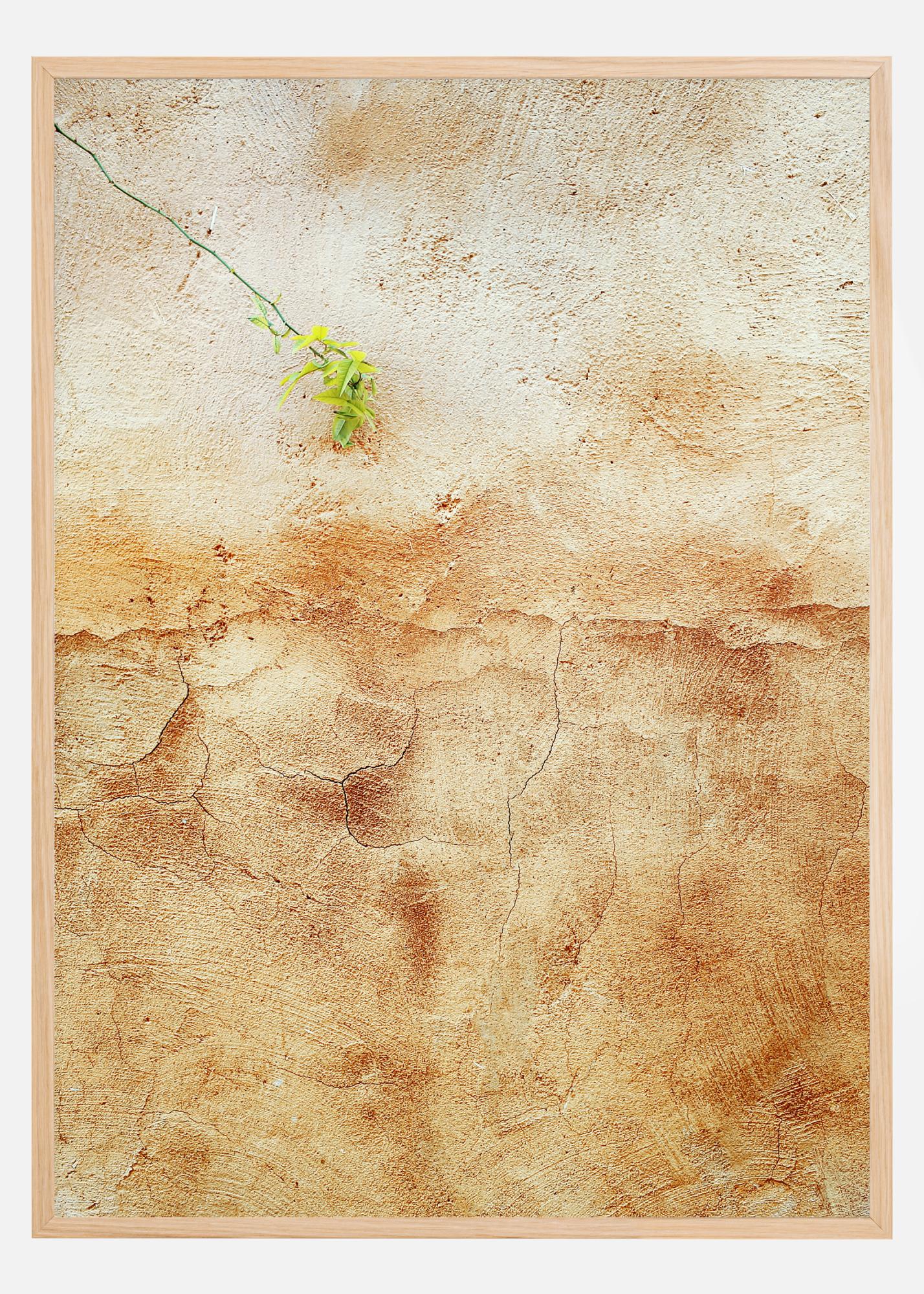 Ein Poster in Großaufnahme einer rissigen Wand, aus der eine winzige hellgrüne Pflanze herauswächst. Das weiche Erdbraun der Wand wird durch den dünnen grünen Riss und die helle Pflanze ausgeglichen. Lassen Sie Ihren Blick schweifen, bis er all die seltsamen Risse in dieser strukturierten Oberfläche findet. Kombinieren Sie dies mit einer ähnlich farbigen Wand, um die beste Illusion zu erzielen.