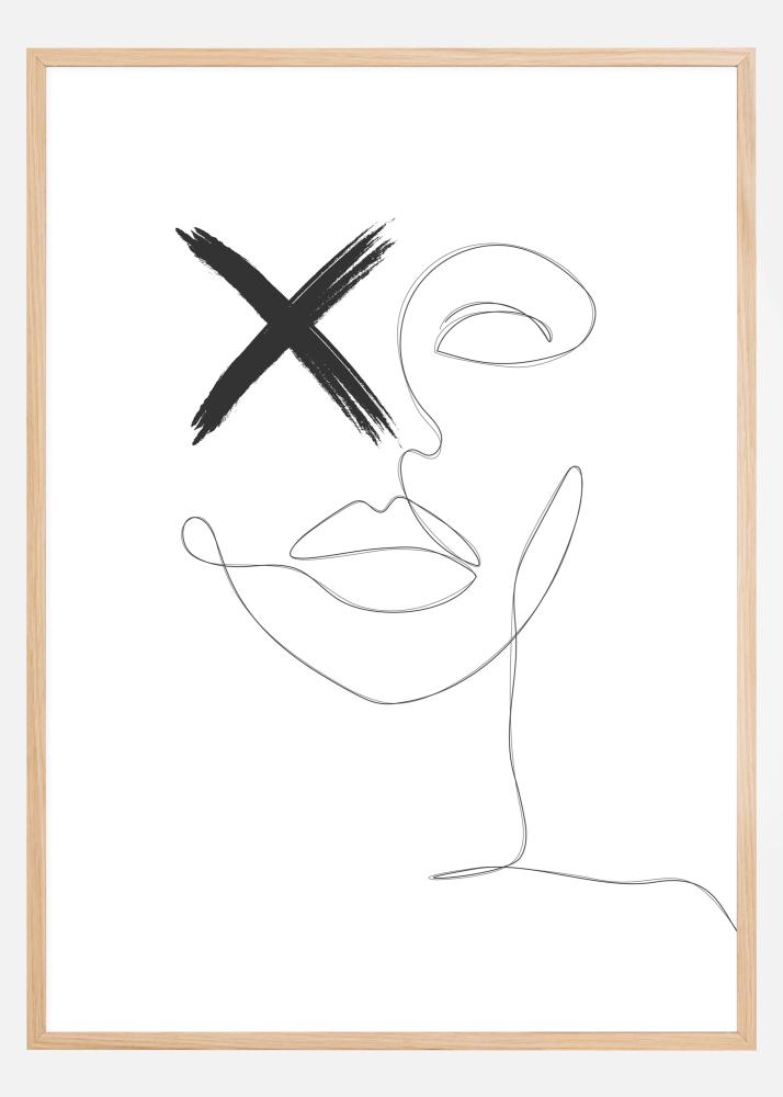 Ein abstraktes Poster eines Gesichts, gezeichnet mit einer dünnen schwarzen Linie auf einem strahlend weißen Hintergrund. Die Linie ist in einer einzigen fließenden Bewegung verbunden, um das Gesicht zu zeichnen. Über einem Auge befindet sich ein großes schwarzes Kreuz. Hängen Sie dieses Poster an eine farbenfrohe Wand und sorgen Sie für Gesprächsstoff in Ihrem Zuhause.
