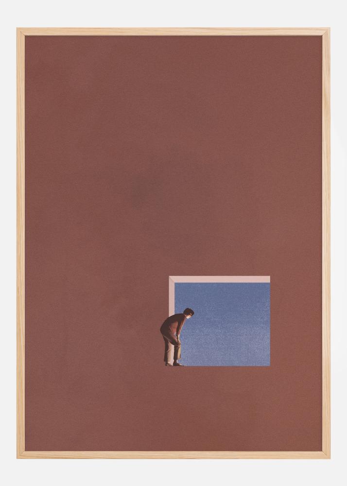Dieses suggestive und konzeptionelle Poster fängt eine einzelne Person ein, die sich nach vorne beugt und durch eine quadratische Öffnung in einen blauen Raum schaut, der die umgebende braune Fläche durchbricht. Dieses einfache, aber kraftvolle Bild kann als Darstellung von Neugier und dem menschlichen Verlangen nach Erkundung und Entdeckung des Unbekannten angesehen werden. Es kann auch eine Metapher für die Fenster der Möglichkeiten und die Bedeutung sein, die Chance zu ergreifen, wenn sie sich bietet.