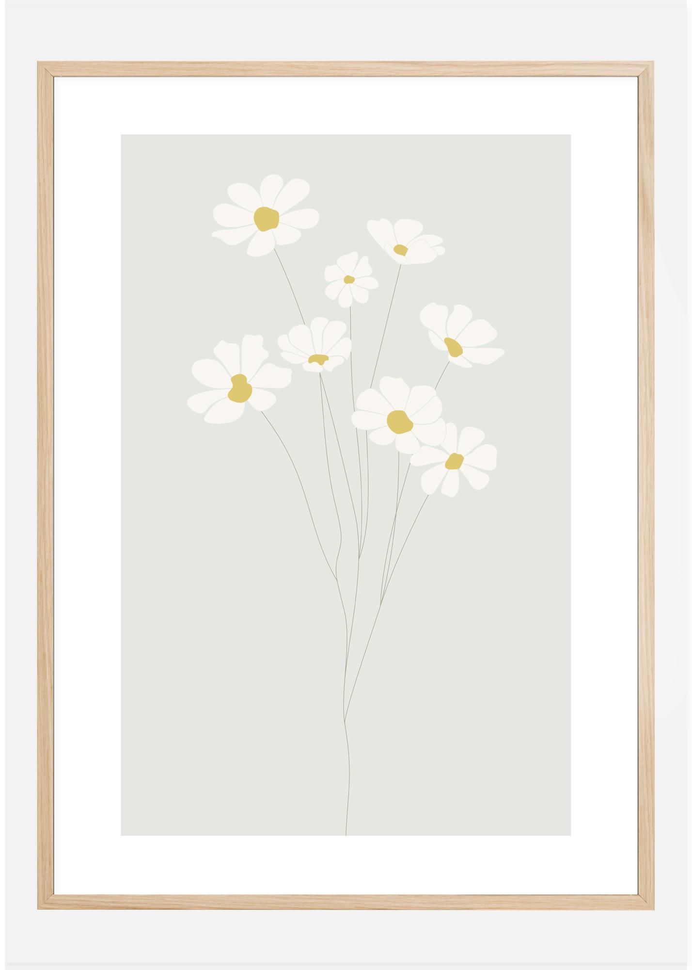 Ein subtiles Poster eines Gänseblümchendrucks mit einem zarten Look. Die schlichten weißen und gelben Blüten recken sich auf schlanken Stielen in die Höhe und sind auf einem sanften, hellblauen Hintergrund zu sehen. Fügen Sie dieses Poster Ihrem Kinderzimmer hinzu, um eine sanfte, aber niedliche Atmosphäre für die Kinder zu schaffen.
