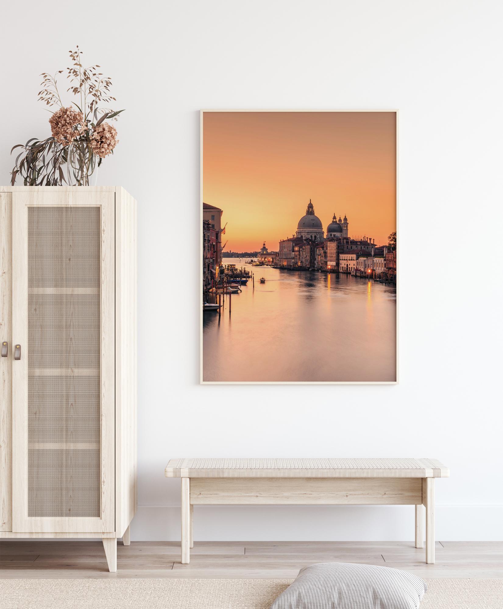 Ein Stadtposter der Morgendämmerung in Venedig. Der breite Kanal öffnet sich zum Meer hin und die Stadt liegt auf beiden Seiten. Der Himmel leuchtet in einem atemberaubenden Orange, während die Sonne über der Kuppel des Doms aufgeht. Spüren Sie die Wärme des neuen Tages mit diesem schönen und friedlichen Bild.