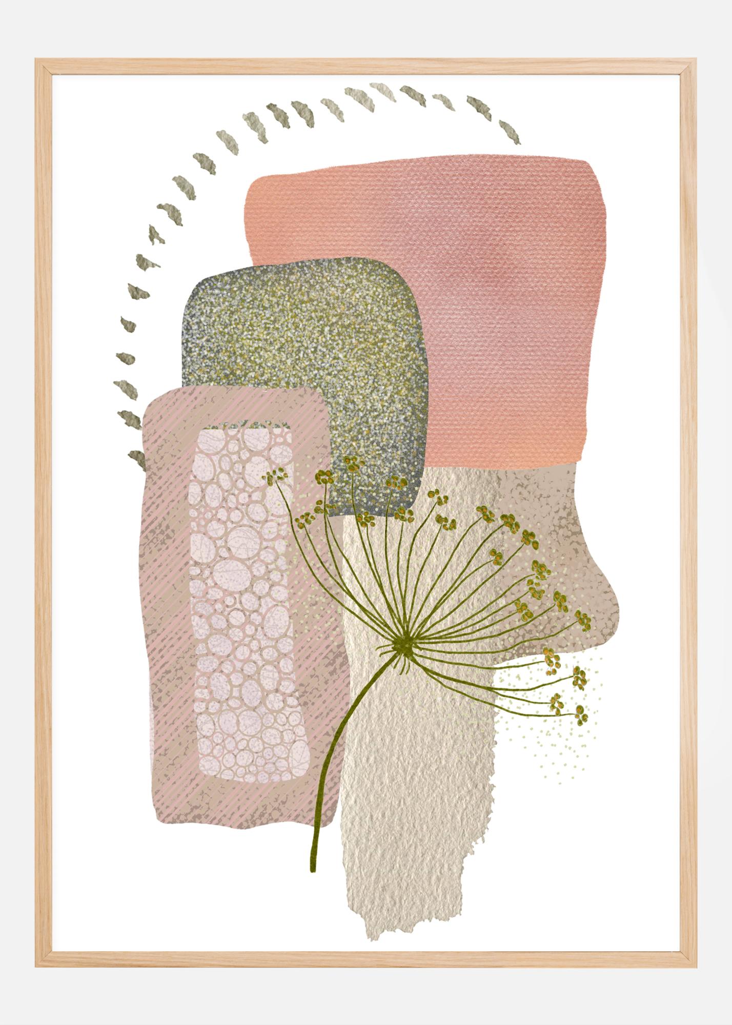 Dieses Poster vermittelt ein Gefühl von Ruhe und Schönheit durch seine entspannte Kombination aus sanften Tönen und abstrakten Formen. Zentral in der Komposition ist ein zarter Blumenstiel, der nach oben ragt, mit seinen kleinen grünen Knospen, die von einem dünnen, anmutigen Stiel aufgehellt werden. Die Überlagerung von Textur und Farbe schafft eine Tiefe und ein Interesse, die das Auge fesseln und zu längerer Betrachtung einladen. Mit seiner beruhigenden Palette aus Rosa und Grün vermittelt dieser Kunstdruck ein Gefühl von Natur Stille und Einfachheit, was ihn zu einer schönen Ergänzung für jedes Zuhause macht.