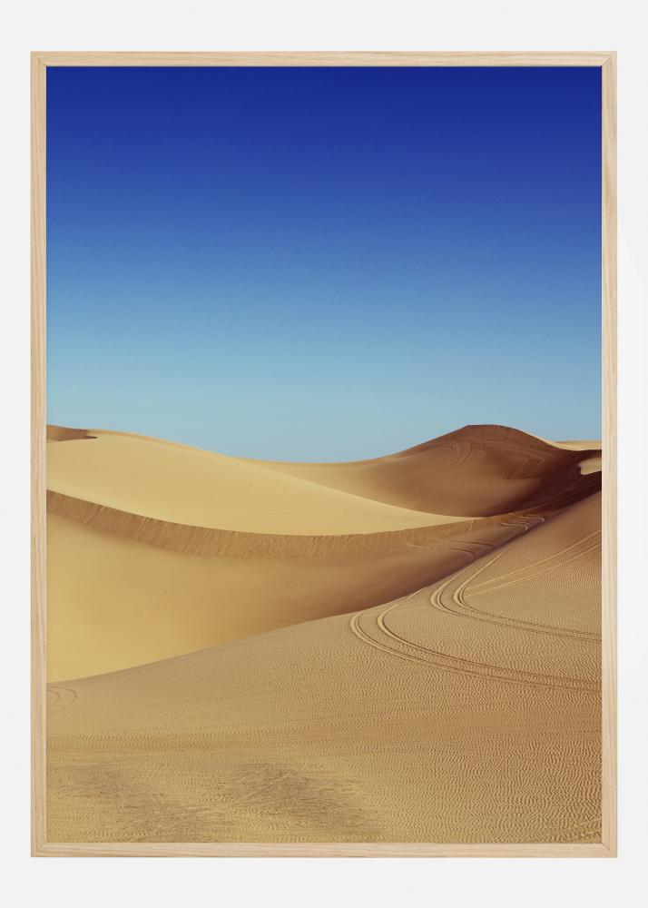 Ein lebhaftes Poster mit atemberaubenden gelben Dünen und zwei Reifenspuren, die in einer Kurve verlaufen. Die leuchtenden Dünen werden durch das aufregende Blau des Himmels noch verstärkt. Verlieren Sie sich in diesem weiten Raum, wenn Sie dieses atemberaubende Bild an Ihre Wand hängen.