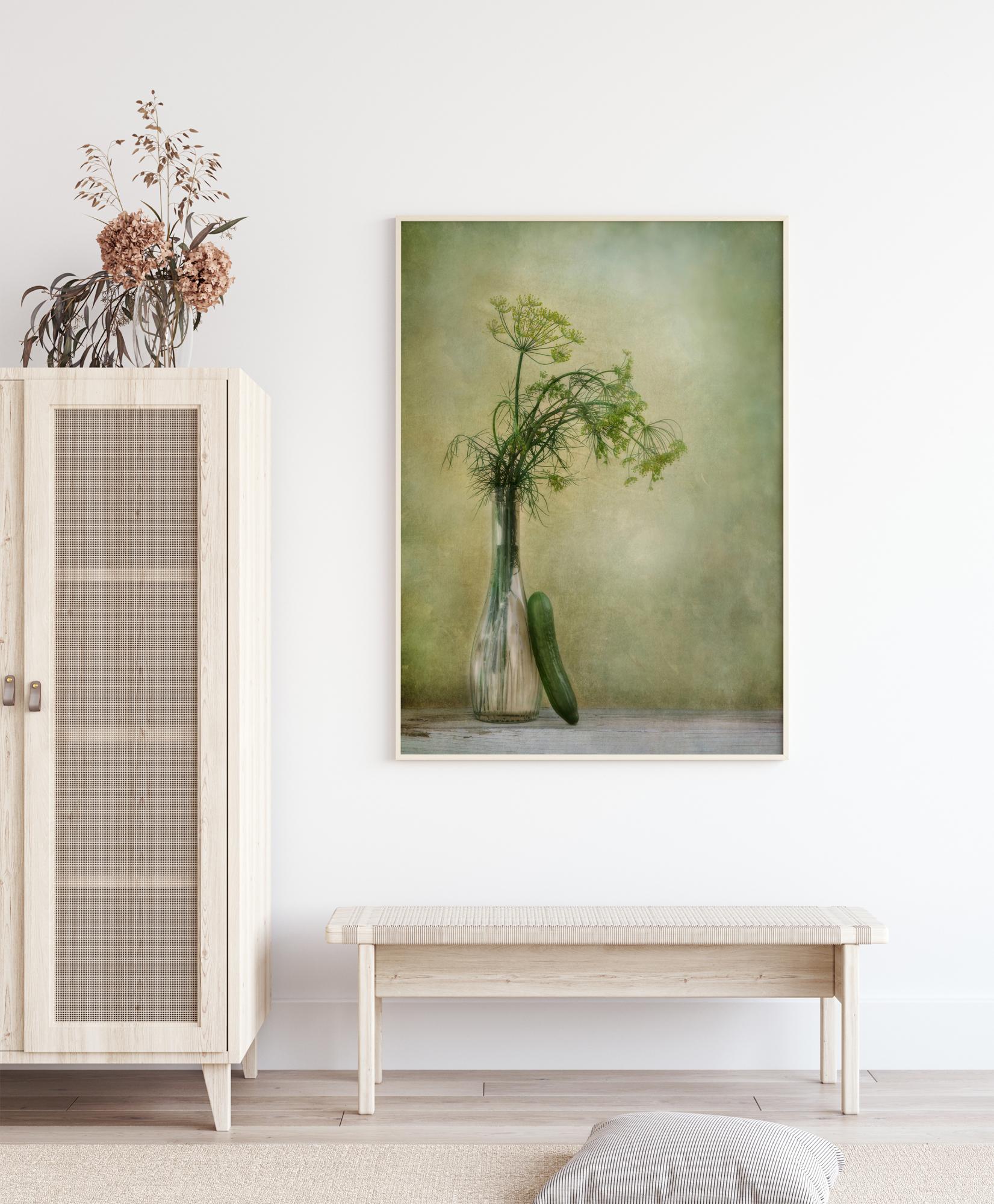 Ein Gemüseposter mit Dill und einer Gurke vor einer sanften grünen und gelben Wand. Die Glasvase hält die Dillzweige, während sich die Gurke in diesem Stillleben an sie lehnt. Die weichen Aquarelltöne im Hintergrund sind um die Blätter herum heller und zu den Rändern hin dunkler. Hängen Sie dieses Bild in einer Küche auf, um eine niedliche, vegetarische Atmosphäre zu schaffen.