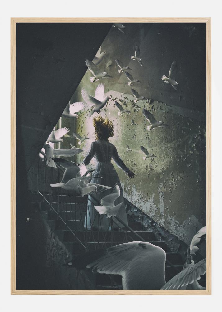 Ein sanftes Poster eines Mädchens, das eine Treppe hinaufgeht, mit einem Schwarm weißer Vögel, die um ihren Kopf fliegen. An den grün-grauen Wänden blättert die Farbe ab, während sie die Treppe hinaufsteigt. Weiße Tauben fliegen umher und heben ihr Haar hoch. Folgen Sie dem Mädchen, wie es die Treppe hinaufsteigt und zwischen den Vögeln ins Licht tritt.