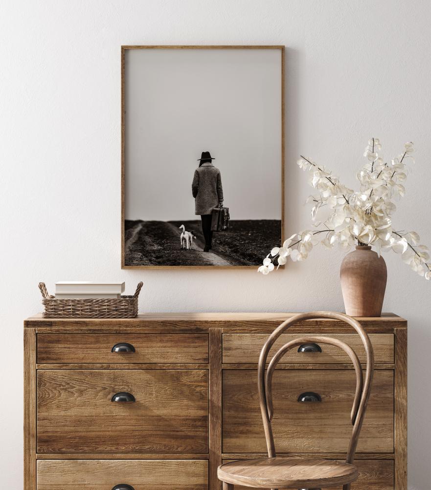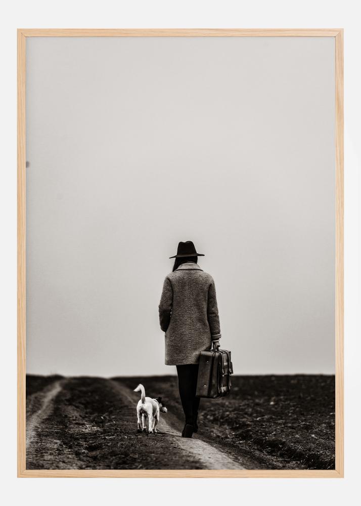 Ein minimalistisches Poster, das eine Frau zeigt, die mit ihrem Hund einen Weg entlanggeht. Der zweispurige Weg führt in die Ferne, während die Frau in einer langen Jacke einen Koffer mit ihrem Terrier trägt. Der weite weiße Himmel ist einladend. Begleiten Sie diese Frau auf ihrer Reise, wenn Sie dieses Schwarz-Weiß-Bild an Ihre Wand hängen.
