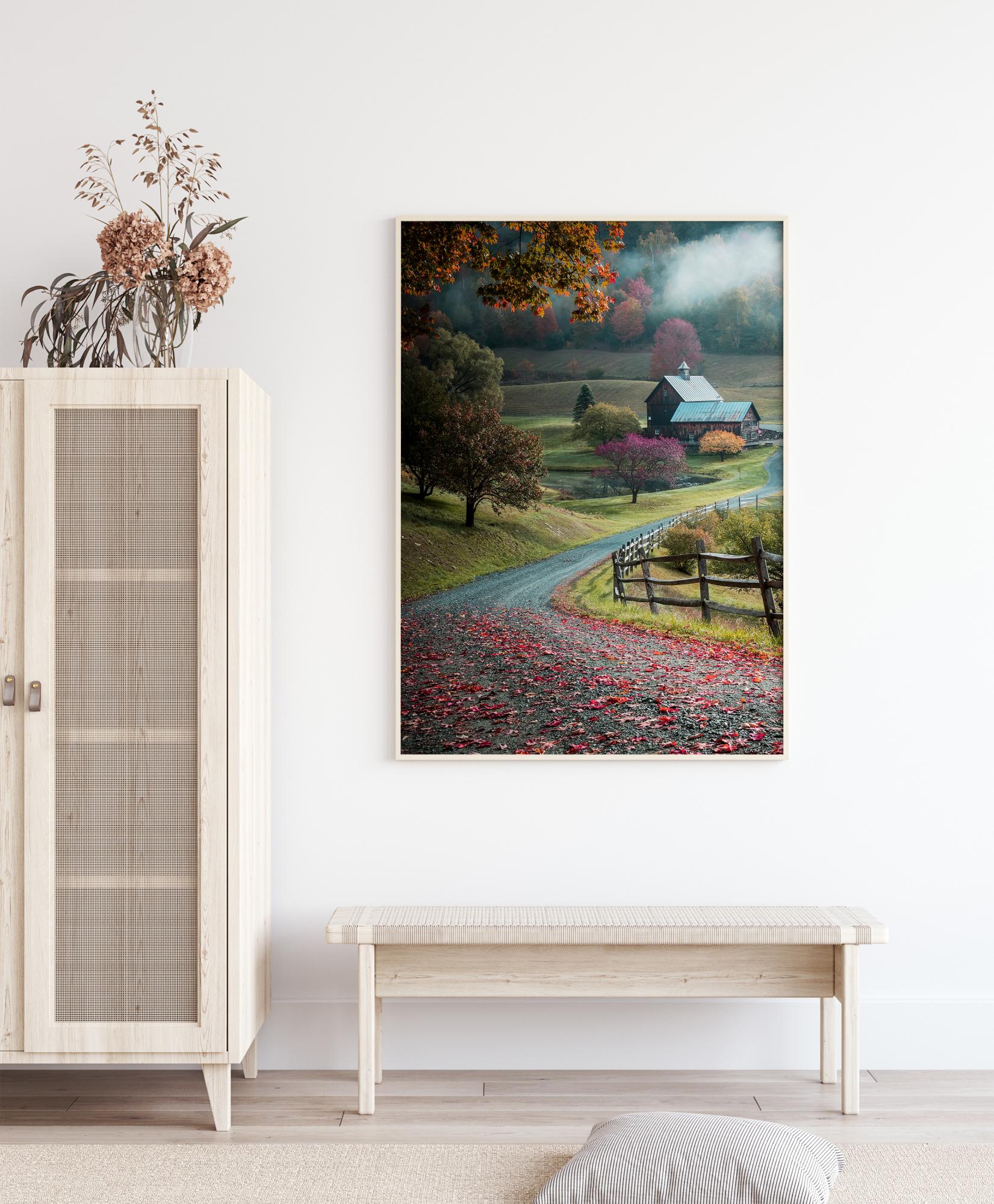 Ein Naturposter, das eine ländliche Szene mit einem Weg, einem idyllischen Bauernhaus und herbstlichen Bäumen zeigt. Rote Blätter liegen auf der Straße, die in ein Tal führt, und auf dem kleinen Haus. Ein Sonnenstrahl durchschneidet das Tal und beleuchtet die herbstlichen Blätter an den Bäumen. Spüren Sie den Charme, wenn Sie dieses Bild mit nach Hause nehmen.