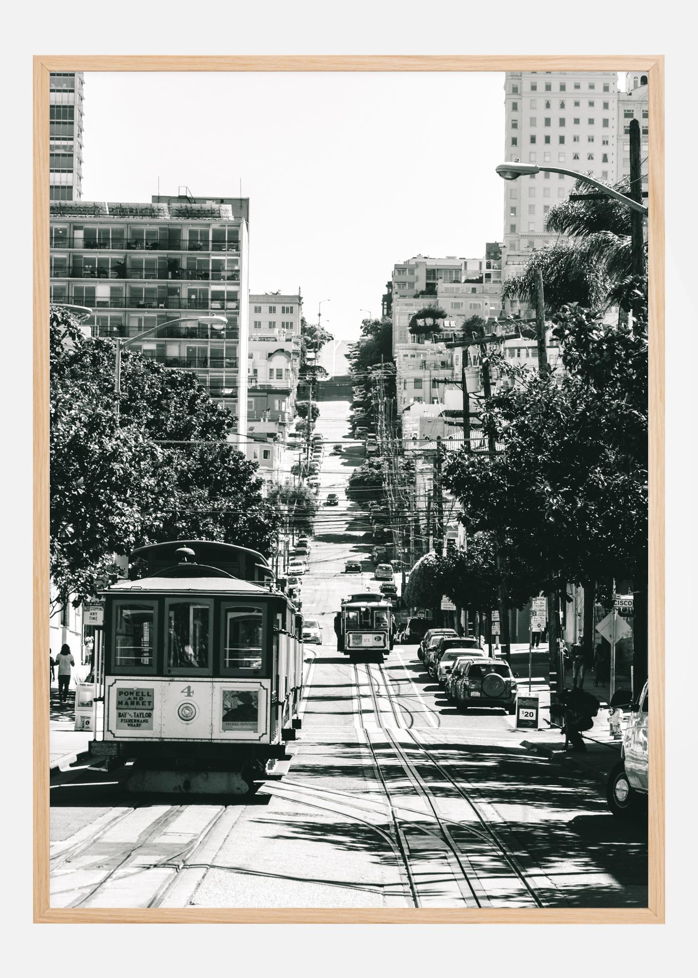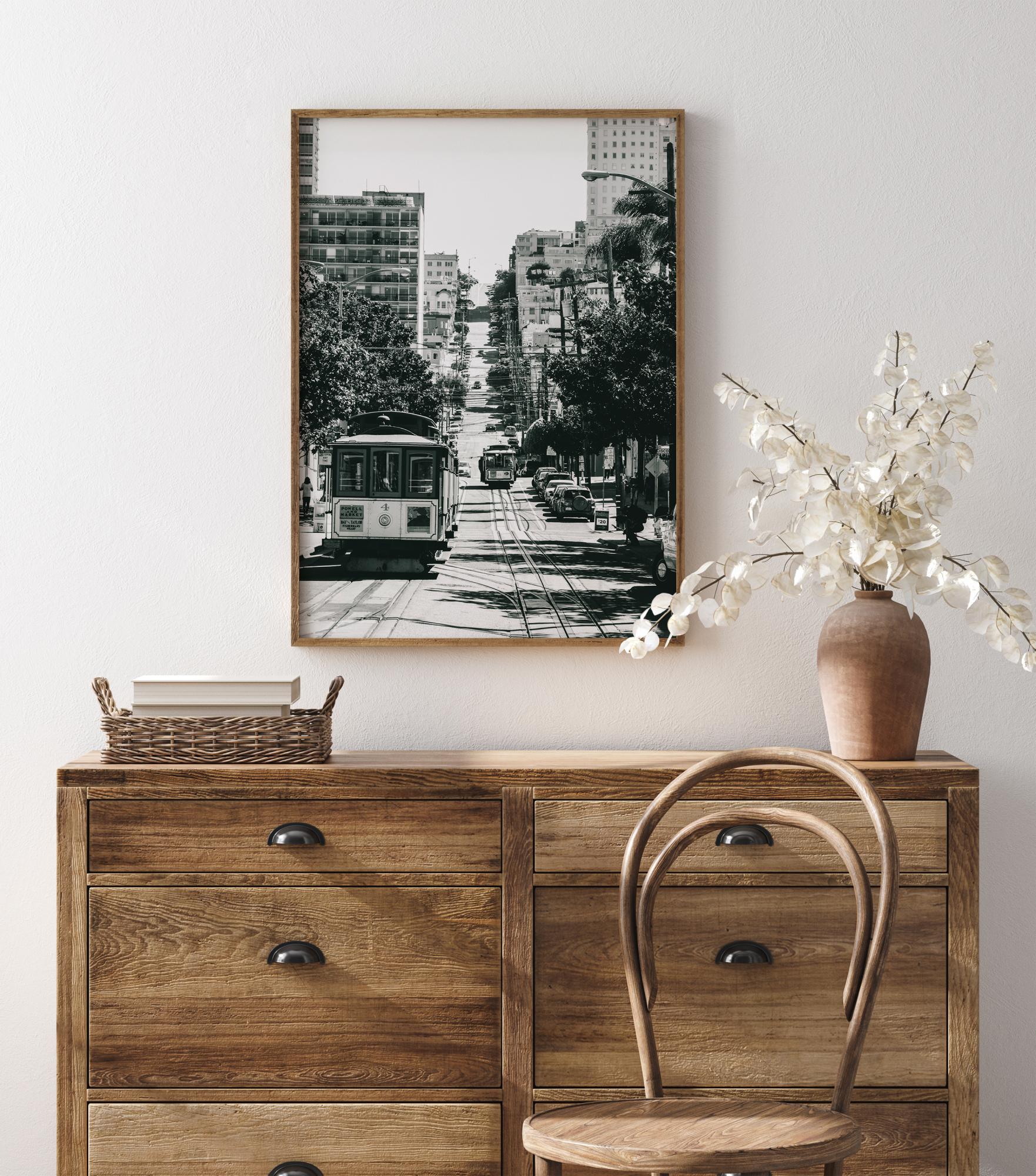 Ein Poster mit einem Stadtbild der Innenstadt von San Francisco. Im Vordergrund ist eine Straßenbahn zu sehen, die zwischen den Häusern und Bäumen auf beiden Seiten den Hügel hinauffährt. Dieser Schwarz-Weiß-Druck verleiht jeder Wand, die Sie zu Hause verschönern möchten, einen Hauch von Klasse.