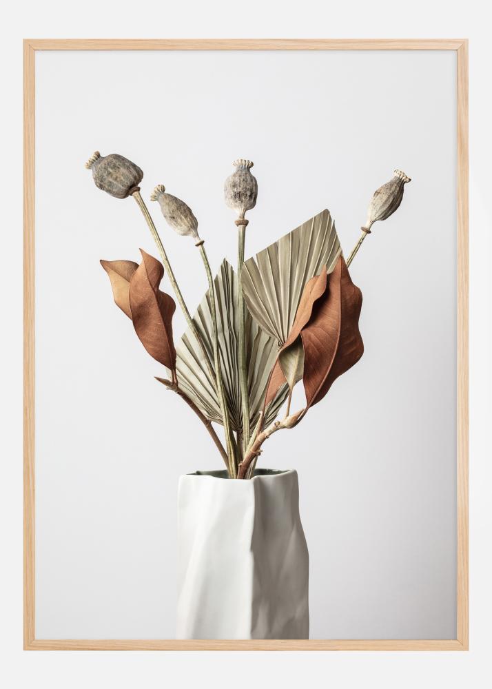 Dieses anspruchsvolle Poster zeigt eine elegante Komposition aus getrockneten Pflanzen und Samenkapseln, die aus einer stilvollen weißen Vase emporsteigen. Die Anordnung ist eine Hommage an die stillstehende Schönheit der Pflanzenwelt, mit verschiedenen Schattierungen von Grau und Braun bis hin zu tiefen Rostrot- und Grün-Tönen. Dieser Druck fängt den Moment der Stille ein, in dem die einzigartige Form und Textur jeder Pflanze in Form von Kunst ewig bewahrt wird.