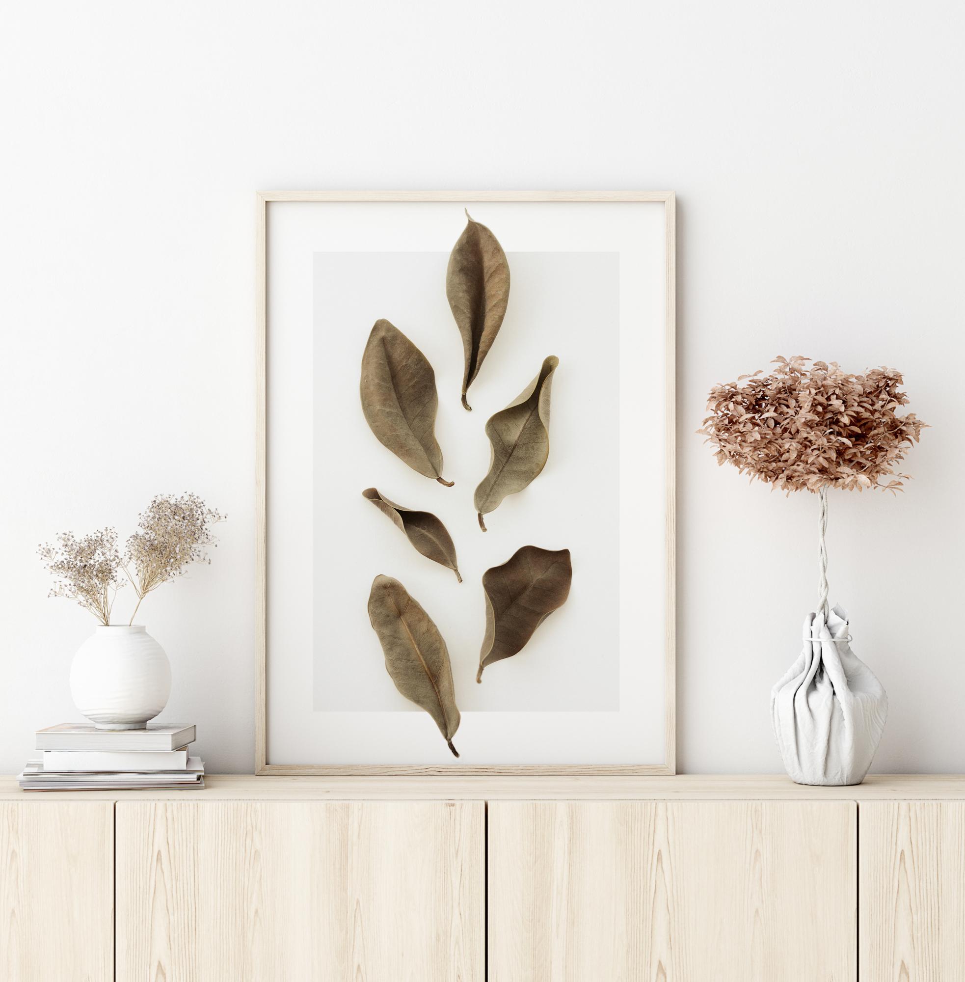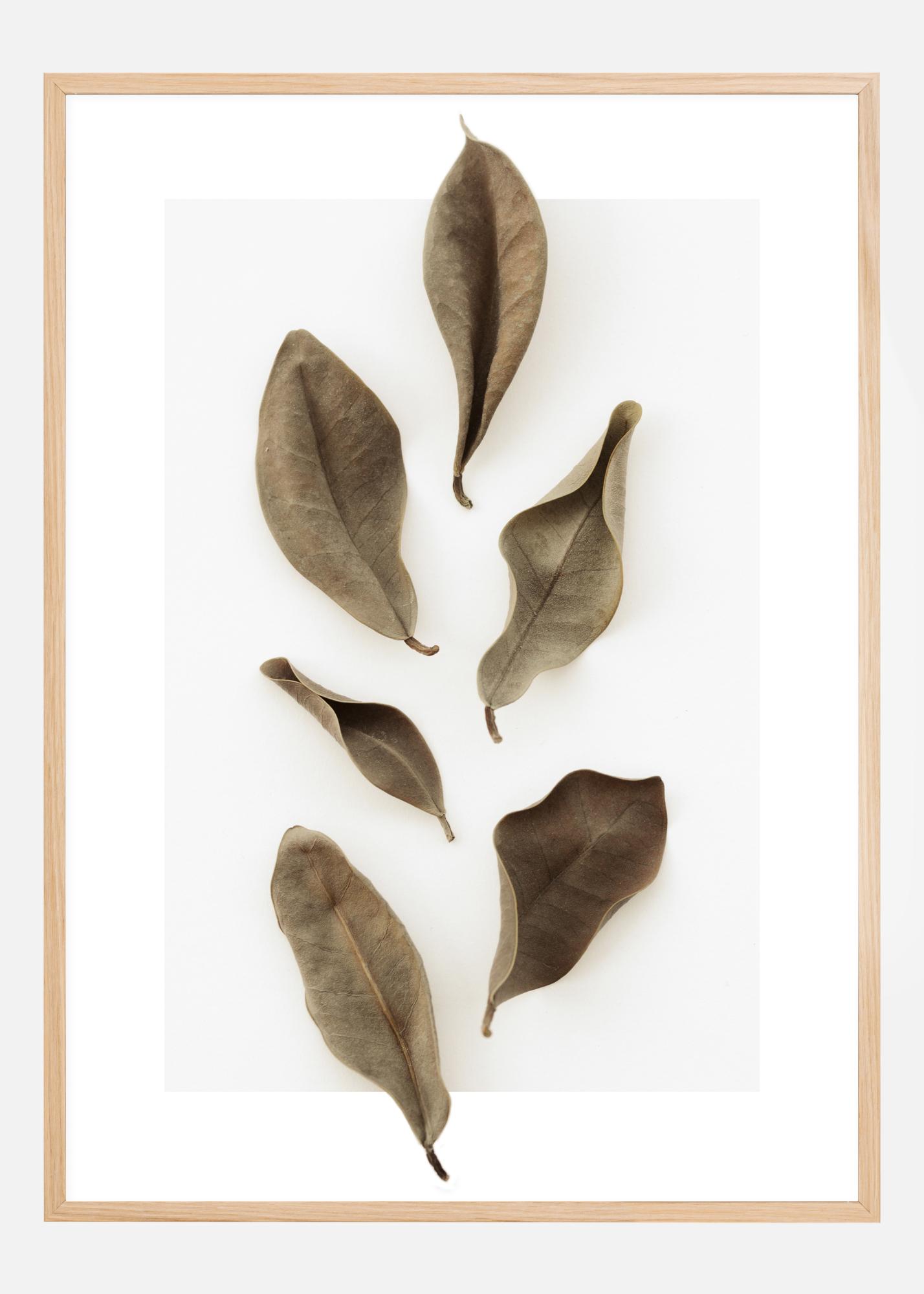 Ein detailreiches Poster von getrockneten Blättern. Sechs getrocknete Blätter sind auf einem weißen Hintergrund so angeordnet, als ob sie noch an einem Zweig befestigt wären. Die braunen Blätter sind einfach und schlicht, perfekt, um eine belebte Wand zu verschönern oder ein Muster in eine schlichte Wand zu bringen.