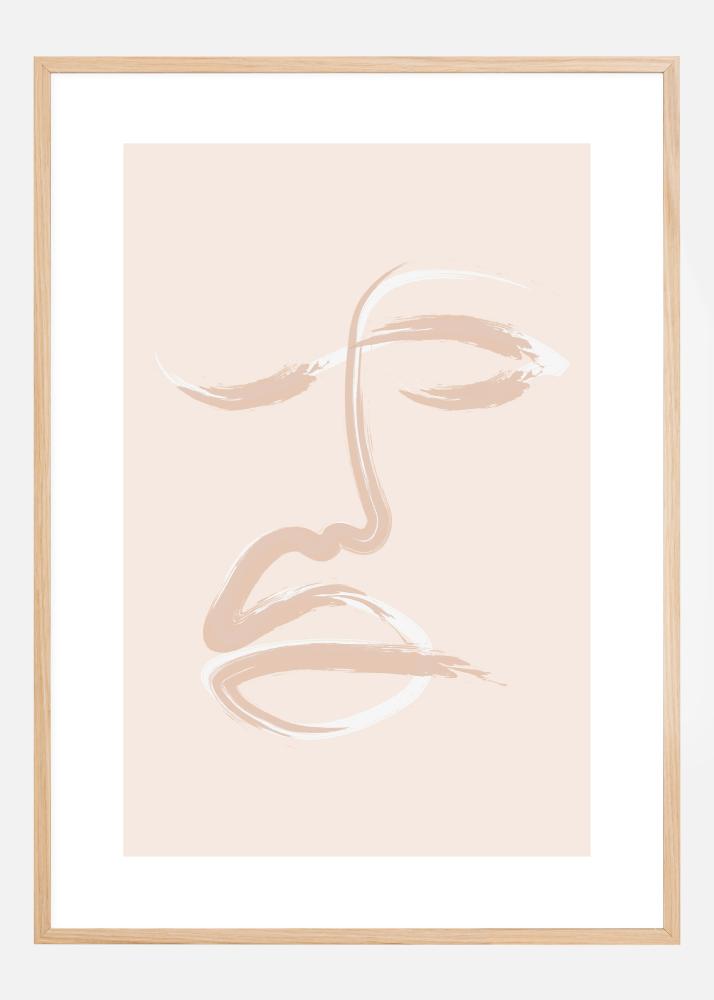 Ein abstraktes Porträtposter mit kräftigen rosafarbenen Pinselstrichen, die ein Gesicht darstellen. Ein einziger Pinselstrich wirbelt über die Seite und bildet die Nase und den Mund. Die Augen sind fast zwinkernd hinzugefügt. Mit dem weißen Rand hebt sich dieses Poster von einer pastellfarbenen Wand ab.