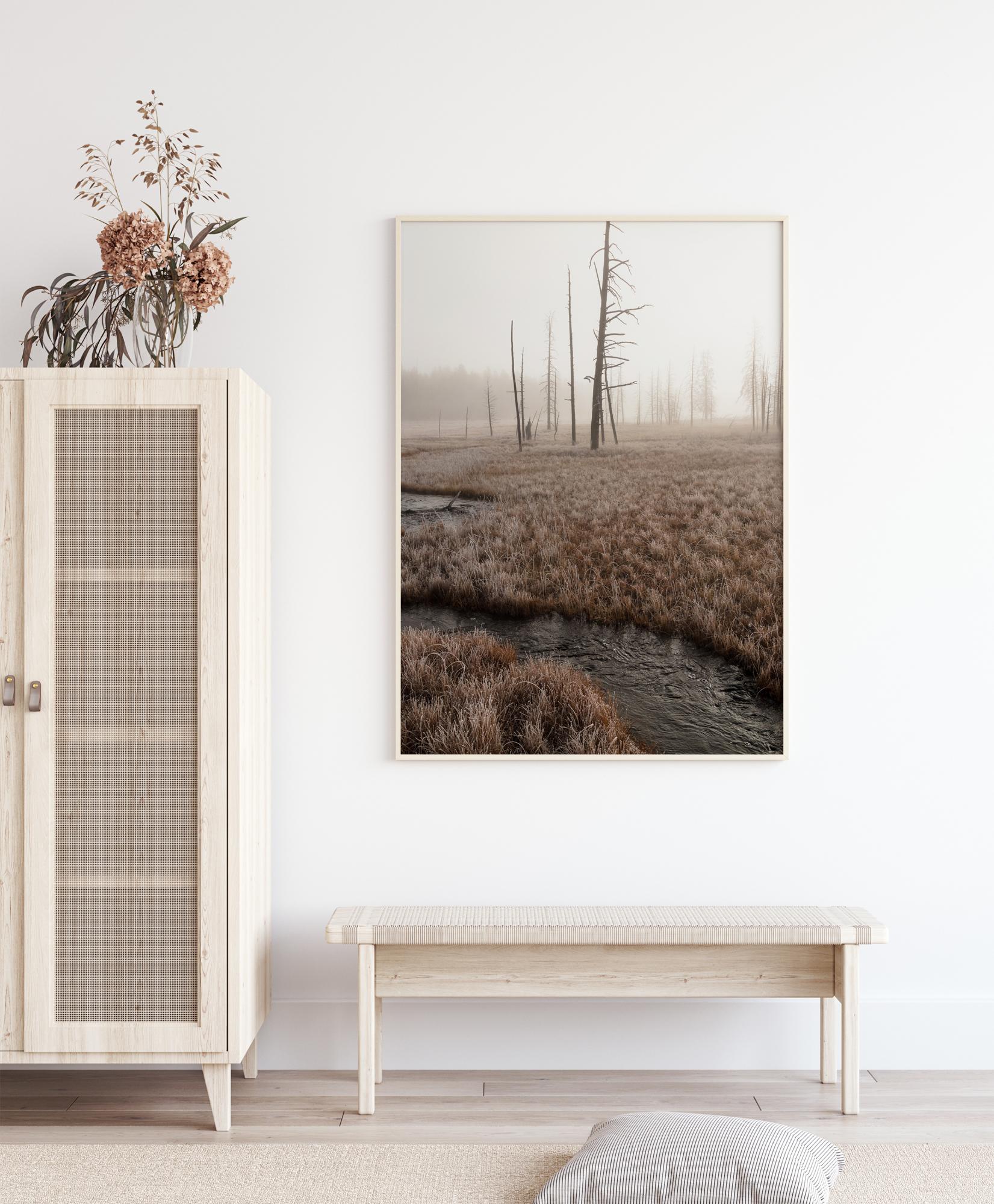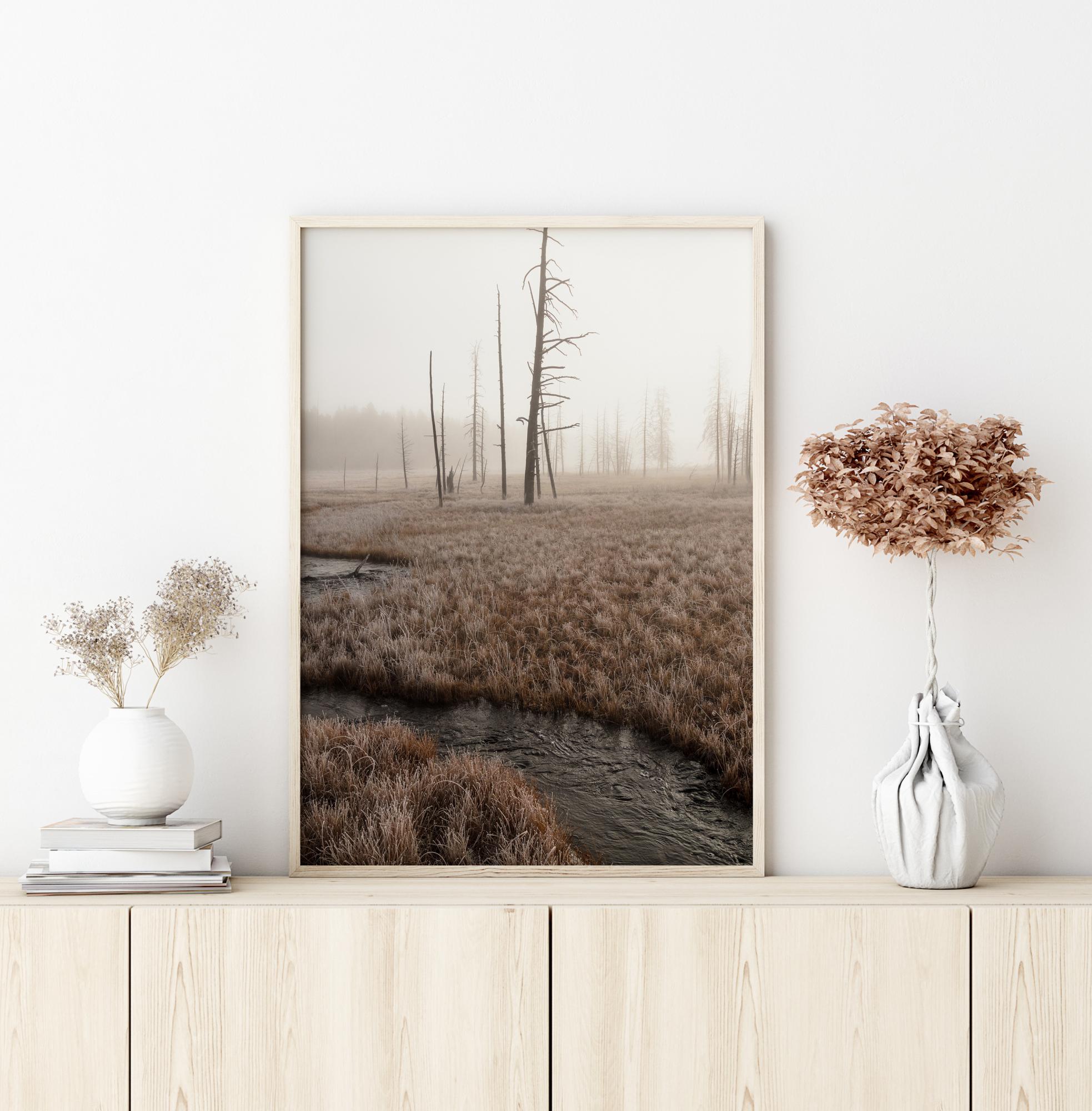 Ein ätherisches Landschaftsposter einer Ebene mit abgestorbenen Bäumen und einem Bach, der sie durchfließt. Diese Aufnahme am frühen Morgen zeigt Nebel, der die Bäume und das gelbe Gras einhüllt. Folgen Sie dem Bach, der sich durch die Landschaft schlängelt, in die Ferne zu einem weit entfernten Wald. Verlieren Sie sich in einer anderen Zeit und an einem anderen Ort, wenn Sie dieses Poster aufhängen.