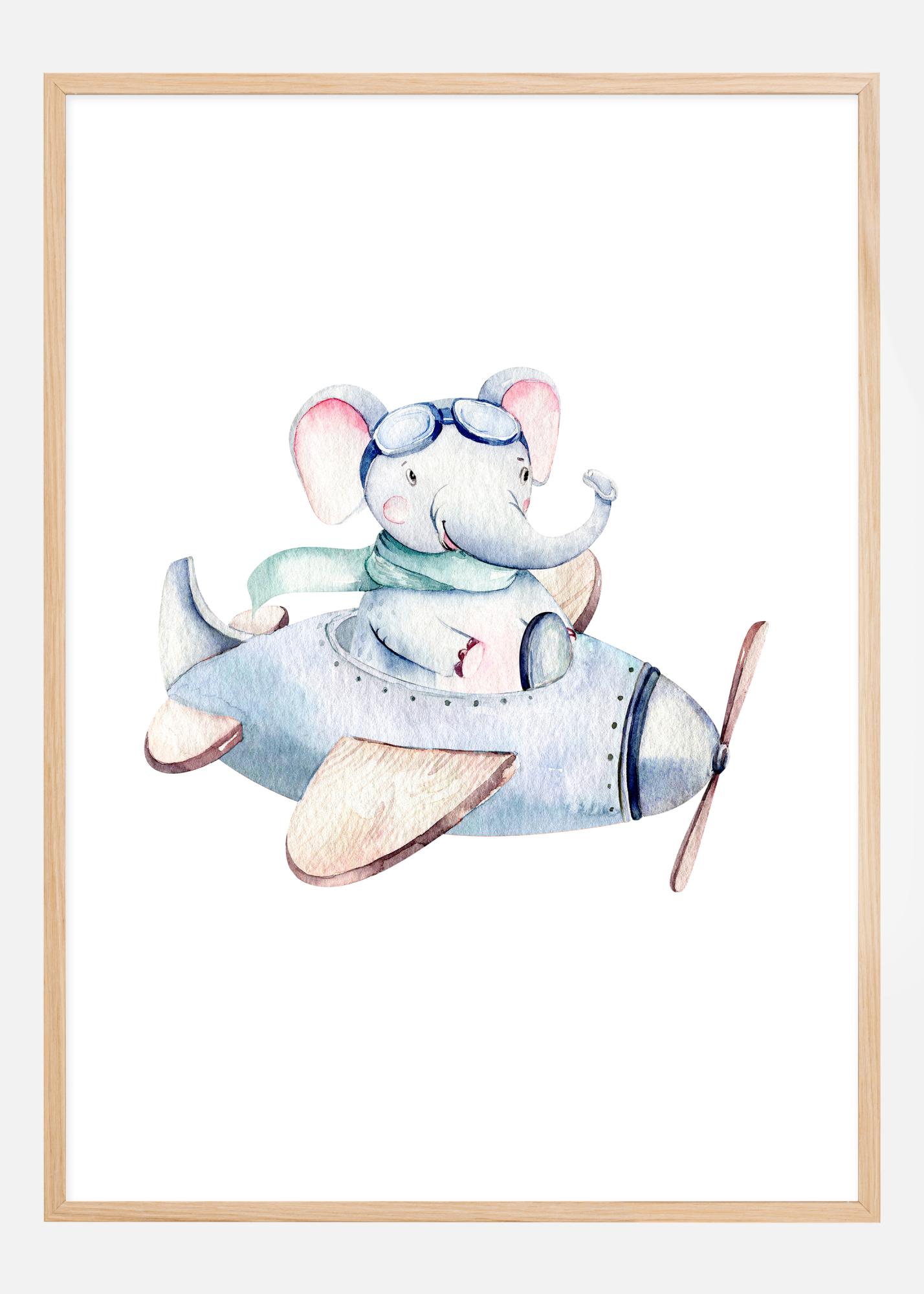 Fangen Sie die Fantasie mit diesem charmanten Poster ein, das einen abenteuerlustigen kleinen Elefanten zeigt, der in einem Vintage-Flugzeug in den Himmel steigt. Perfekt, um Träume von Abenteuern bei den Jungen und Junggebliebenen zu wecken, bietet dieser Druck eine wunderbare Kombination aus Verspieltheit und Nostalgie. Die bläuliche Illustration, verstärkt durch das fröhliche Lächeln des Elefanten und die Fliegerbrille, ruft Bilder von himmlischen Abenteuern und Entdeckungsreisen hervor.