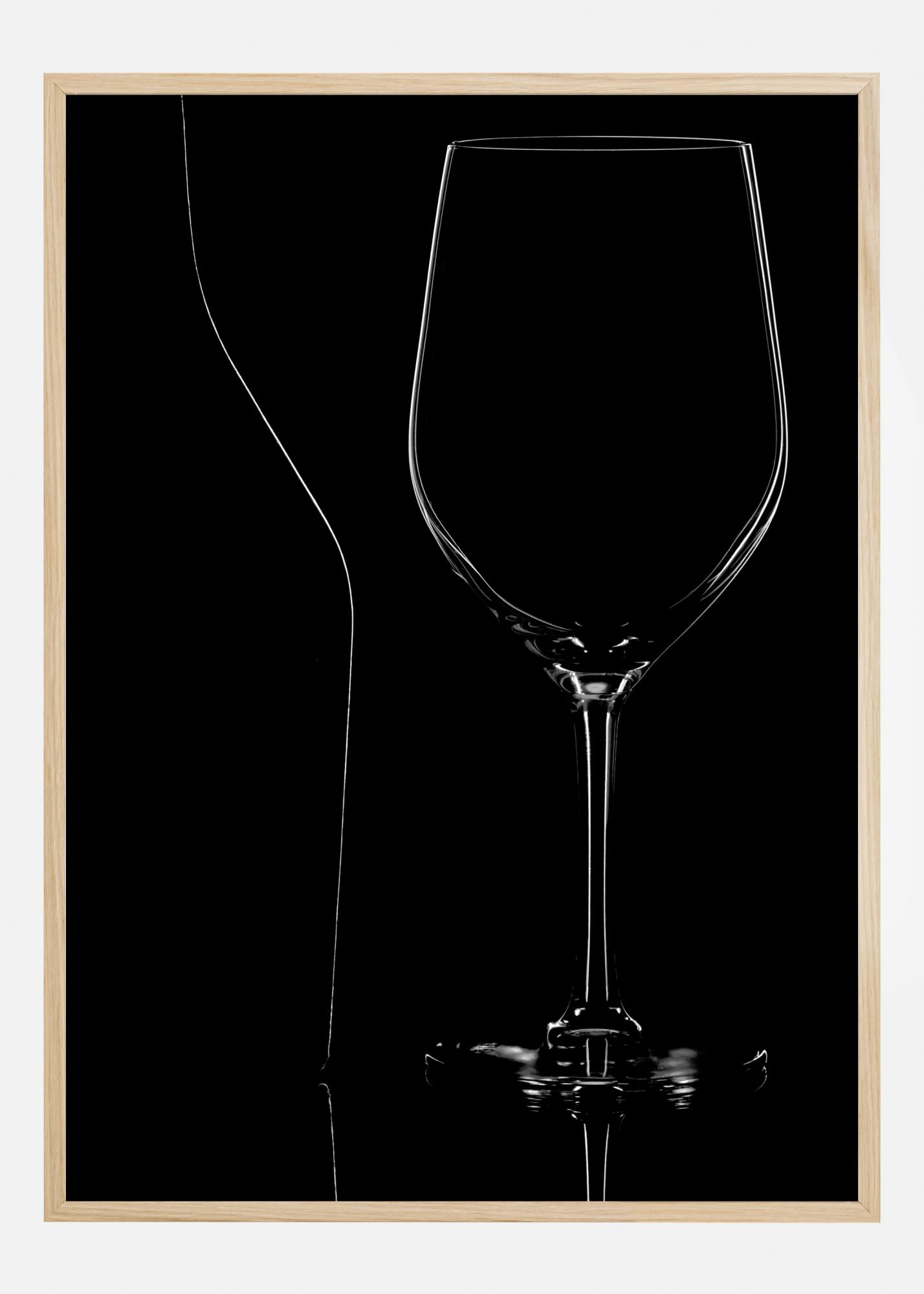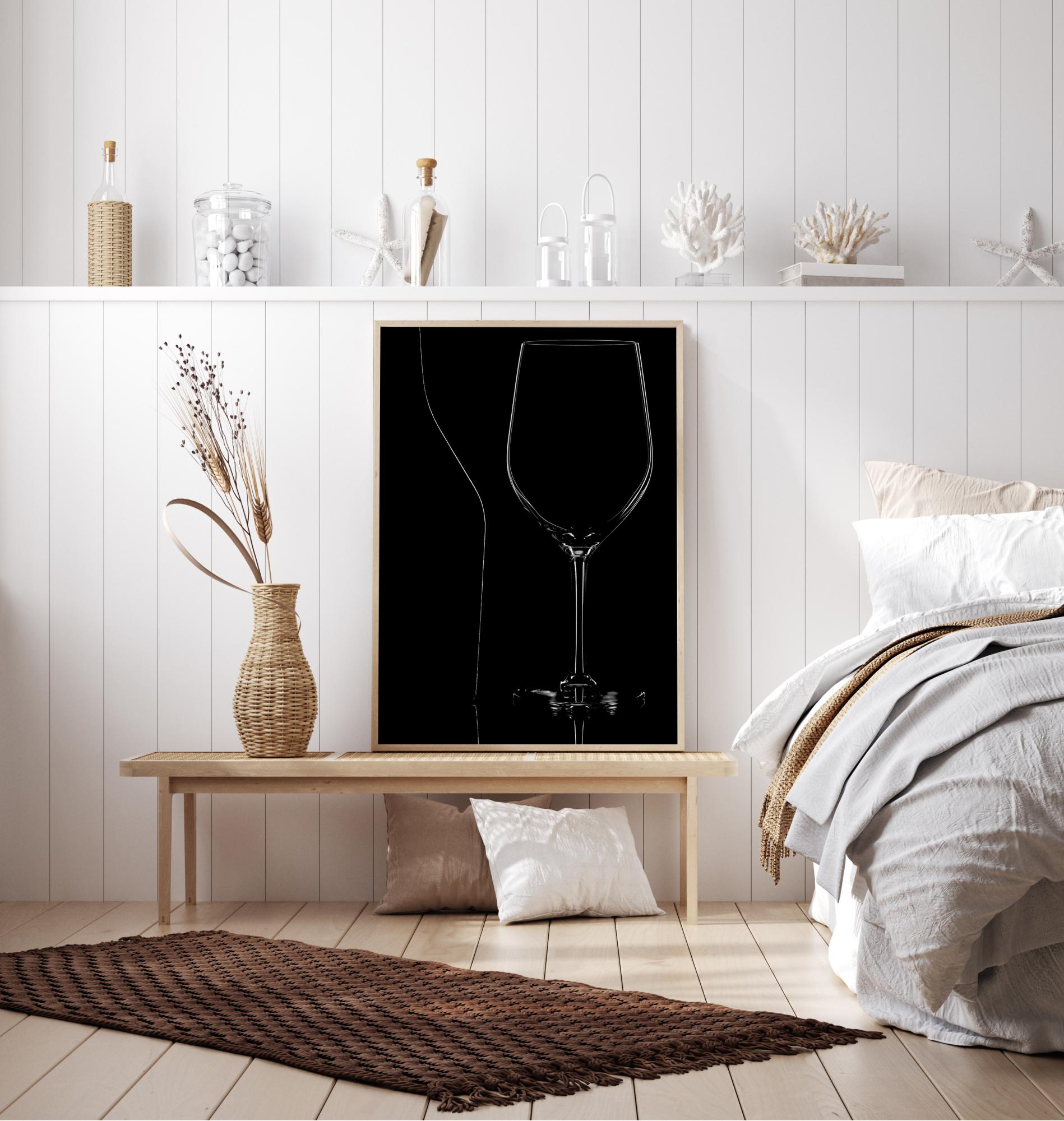 Ein elegantes Poster eines Weinglases vor einem schwarzen Hintergrund. Dieses abstrakt anmutende Werk strahlt Klasse aus, da man das Glas nur durch das reflektierte Licht am Rand sieht. Kombinieren Sie es mit einer weißen Wand, um die dramatische Eleganz beizubehalten.