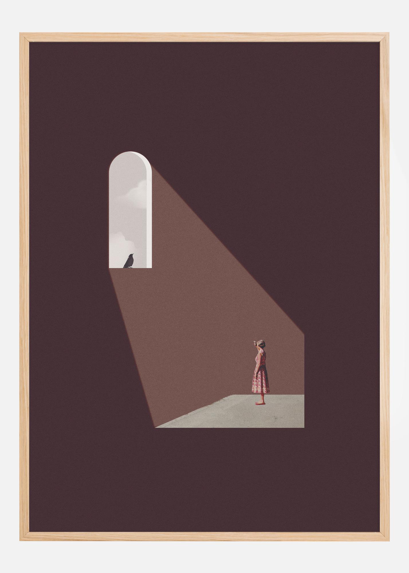 Dieses minimalistische Poster fängt einen ruhigen Moment der Nachdenklichkeit ein. Eine einzelne Figur steht unter einem Lichtstrahl, der durch ein Fenster fällt, was Erleuchtung und Reflexion symbolisiert. Das Bild ist in weichen braunen und beigen Tönen getränkt, die eine warme und einladende Atmosphäre schaffen.