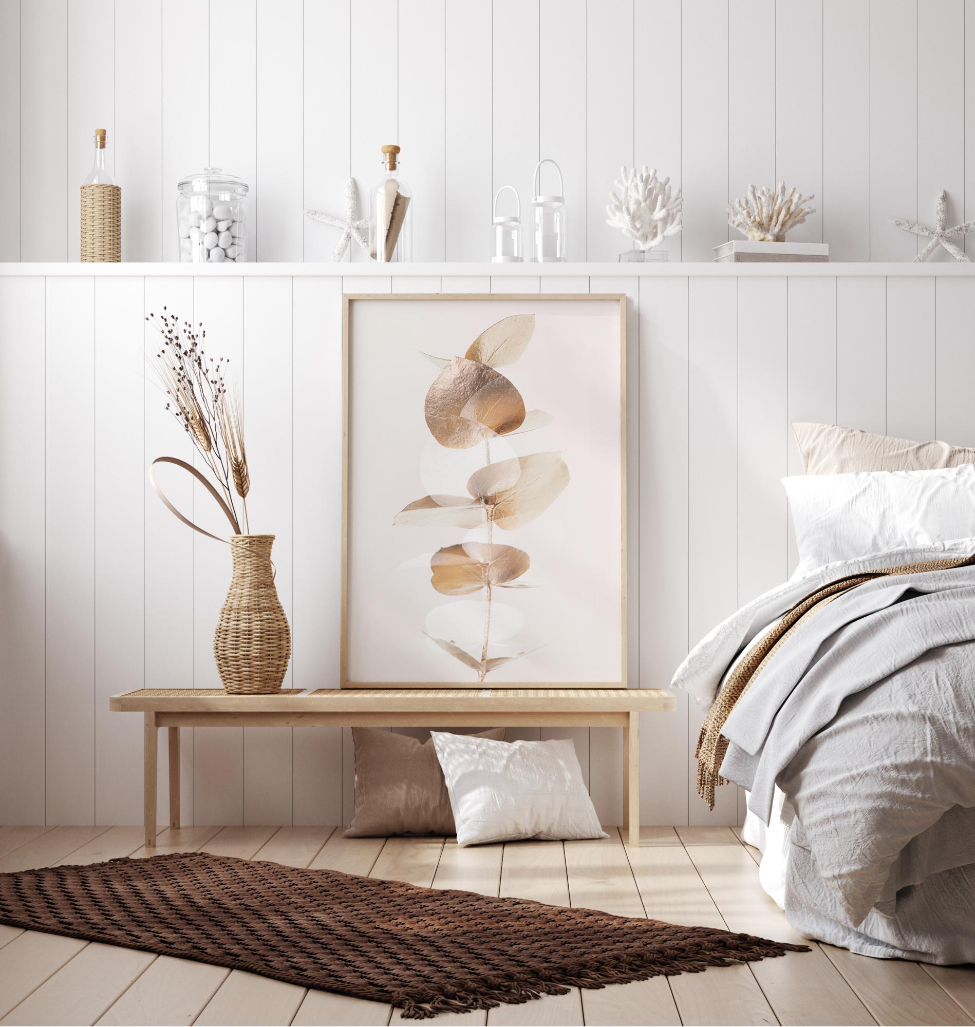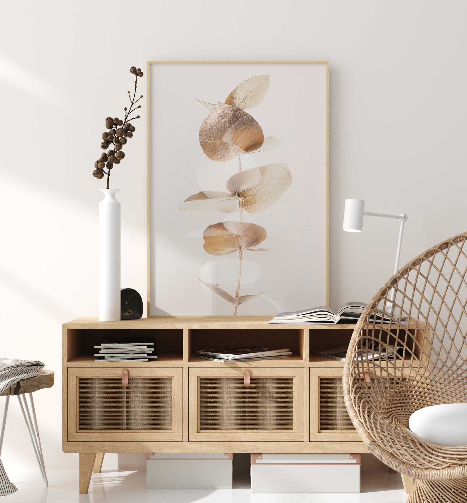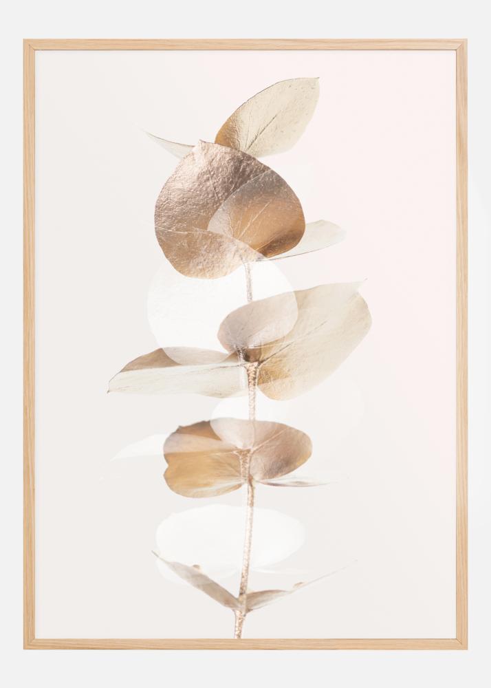 Ein Poster mit einer Nahaufnahme einiger goldener Eukalyptusblätter. Die schlichte Eleganz dieses Bildes wird durch den schlichten weißen Hintergrund noch verstärkt. Die goldenen Blätter schimmern sanft, während sie das Poster mit ihrem sanften Schein füllen und ein Gefühl der Ruhe im Haus hervorrufen.