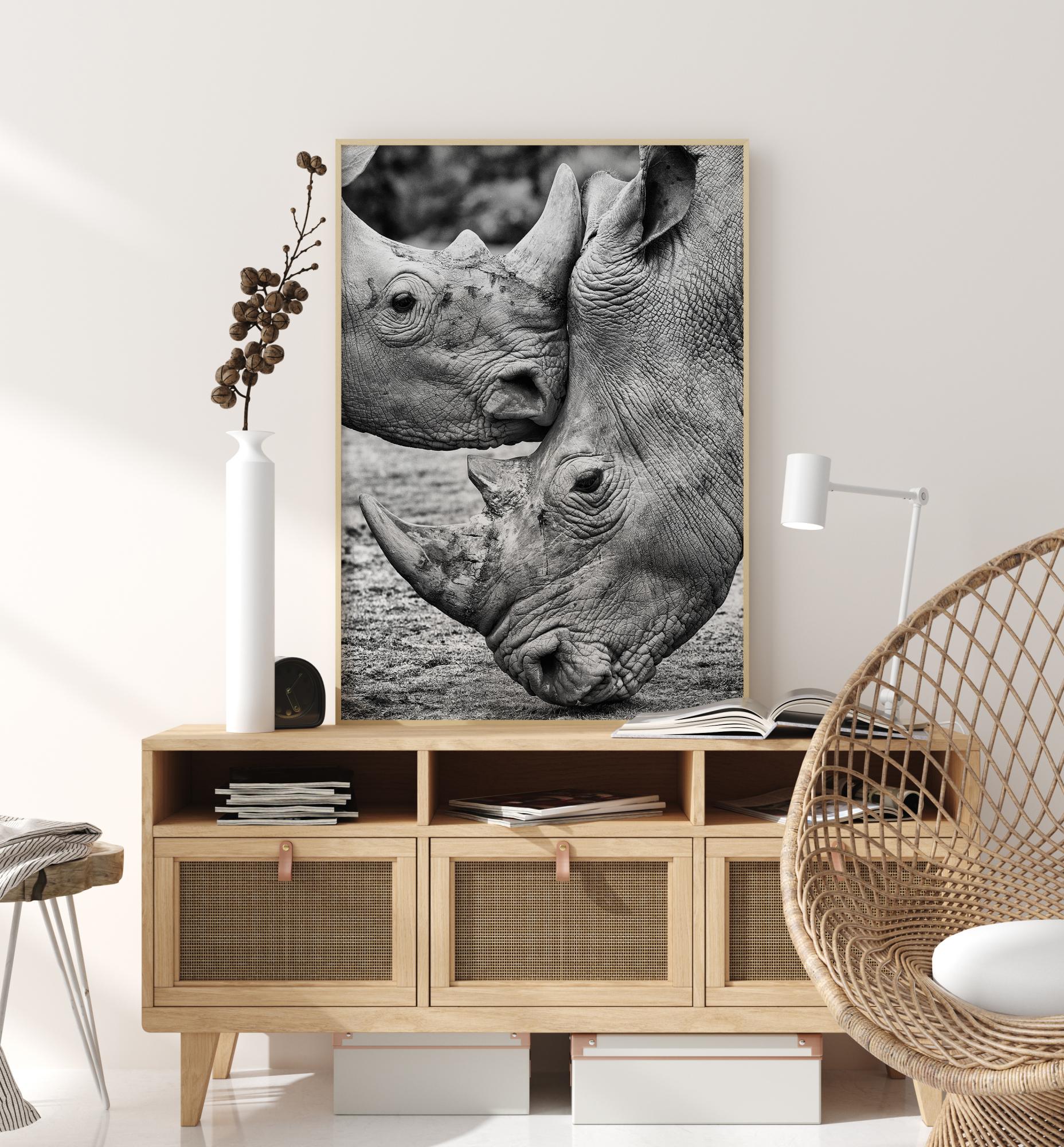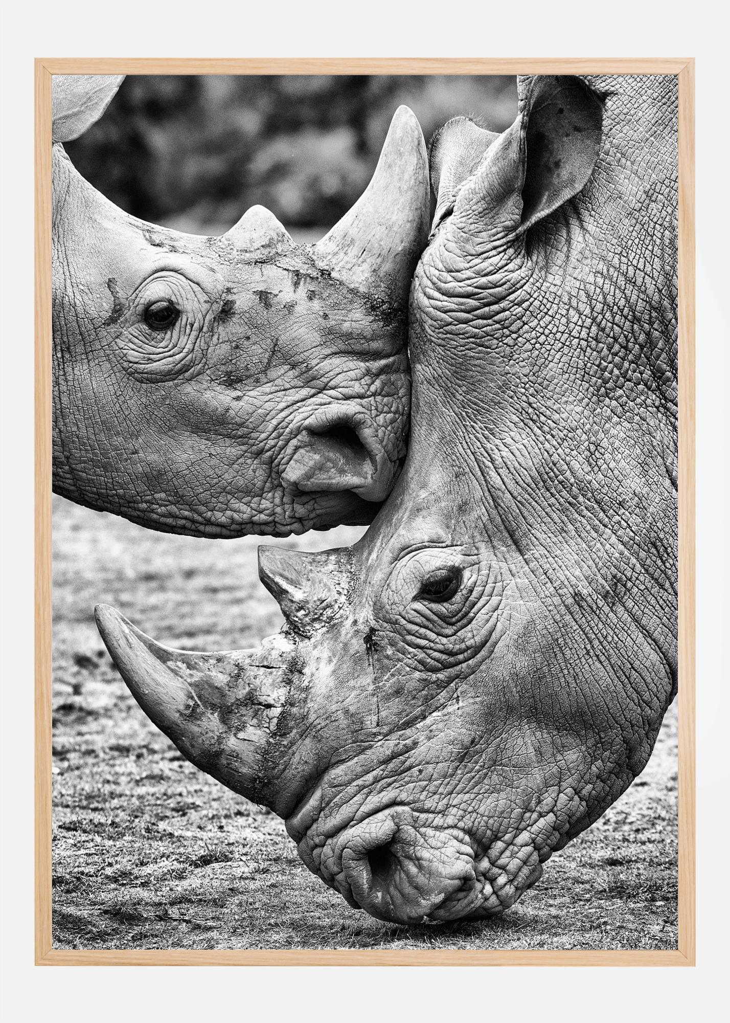 Ein majestätisches Poster zweier Nashörner, die sich gegenüberstehen. Bringen Sie die Ehrfurcht und das Wunder der Natur mit diesem atemberaubenden Druck in Ihr Zuhause. Spüren und genießen Sie die Ruhe mit diesem Poster.