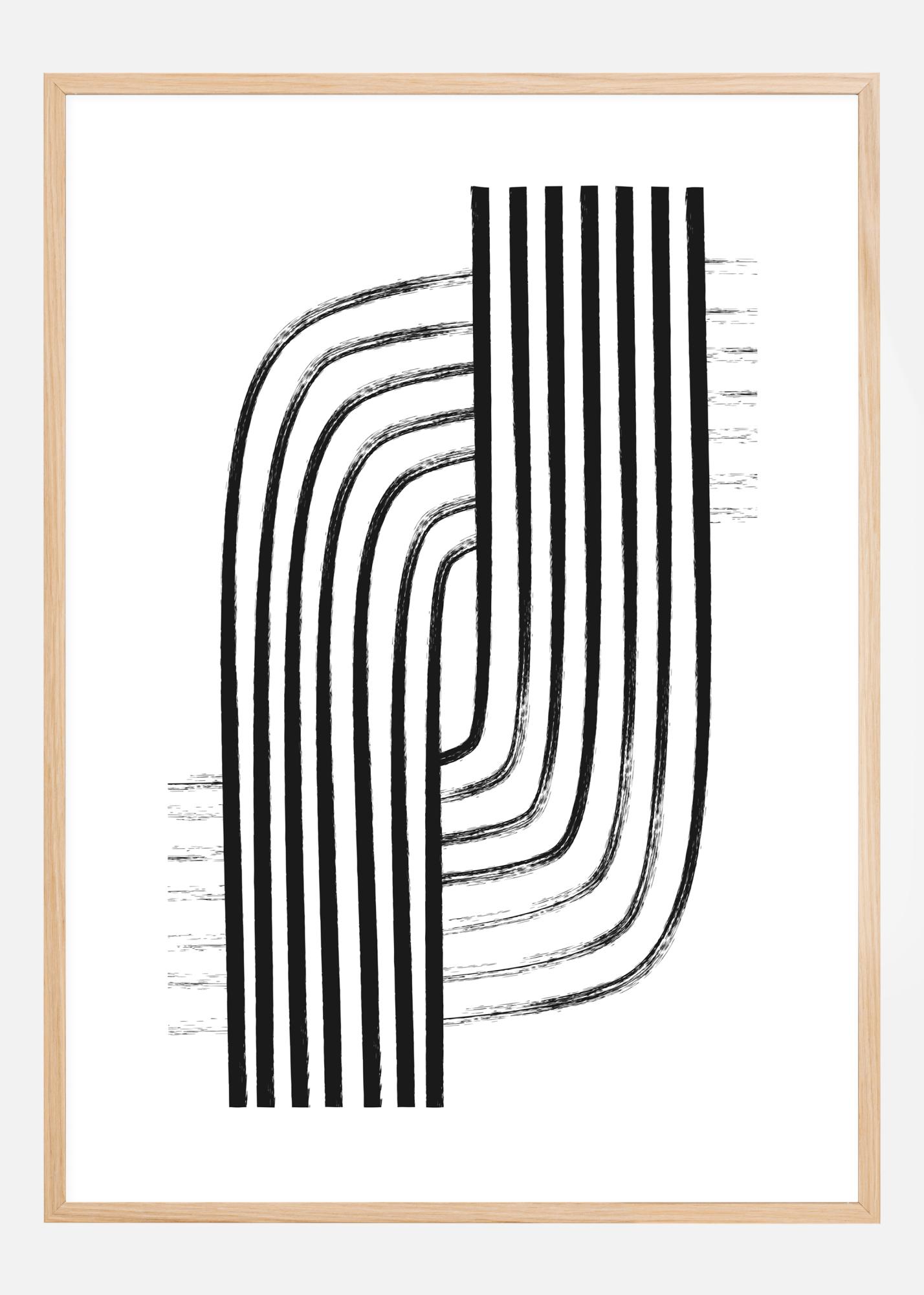 Ein einfaches Poster mit schwarzen Linien, die ein Muster bilden. Das Bild besteht aus sieben schwarzen Linien, die gerade nach oben verlaufen, sich dann krümmen und wieder verschwinden. Eine zweite Reihe von Linien spiegelt die erste wider und verläuft in die entgegengesetzte Richtung. Verwandeln Sie Ihr Zuhause in eine Galerie mit diesem experimentellen Werk.