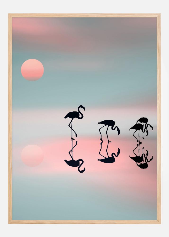 Ein vibrierendes Poster von vier Flamingos, die an einem hellen, pastellfarbenen See fressen. Blaues, rosafarbenes und pfirsichfarbenes Licht erzeugt ein weiches Bild, während die Silhouetten dieser Flamingofamilie sanft den See überqueren. Man kann den Frieden in diesem sanften, subtilen Bild fast spüren.