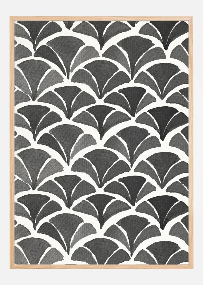 Geben Sie Ihrem Raum einen Hauch von künstlerischer Eleganz mit diesem Poster, das ein fesselndes Muster aus Blattfedern in Schwarz und Weiß aufweist. Dieses Druckstück hat ein sich wiederholendes Muster, das an Vintage-Ventilatoren erinnert, die rhythmisch über die gesamte Oberfläche arrangiert sind, um ein Gefühl von Bewegung und Symmetrie zu erzeugen. Der stilvolle Kontrast zwischen Schwarz und Weiß verleiht einen klassischen Look, der in viele verschiedene Einrichtungsstile und Umgebungen passt.