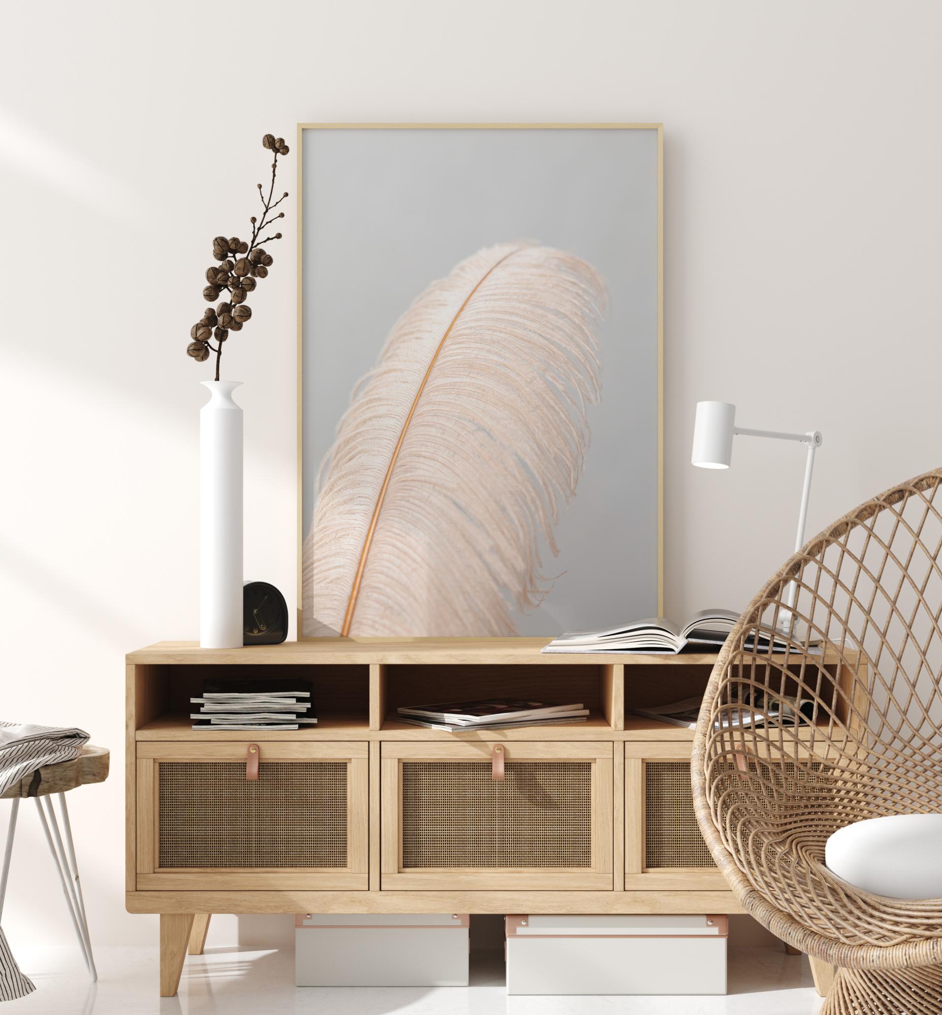 Ein Poster einer großen Straußenfeder in Nahaufnahme. Die zarten weißen Widerhaken fallen zu beiden Seiten der rosa Mittelrippe der Feder herab. Der Hintergrund in Entenei-Blau verleiht dem Bild eine märchenhafte Atmosphäre. Die perfekte Ergänzung für ein Babyzimmer.