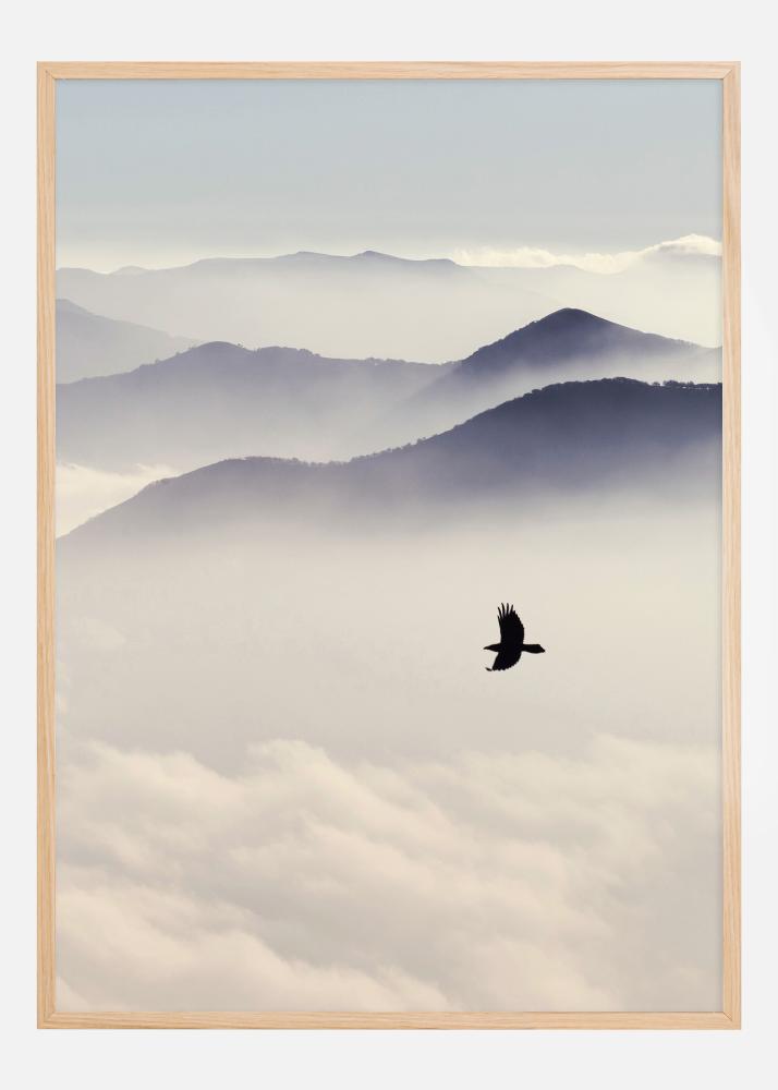Dieses naturinspirierte Poster fängt ein einfaches, aber dennoch kraftvolles Bild von Freiheit und Stille ein. Ein einzelner Vogel segelt majestätisch über ein nebliges Tal, mit Bergschichten, die im weichen Licht der Morgendämmerung oder Abenddämmerung allmählich verschwinden. Die sanften Töne und die minimalistische Landschaft vermitteln ein Gefühl von Ruhe und unbegrenzter Freiheit.