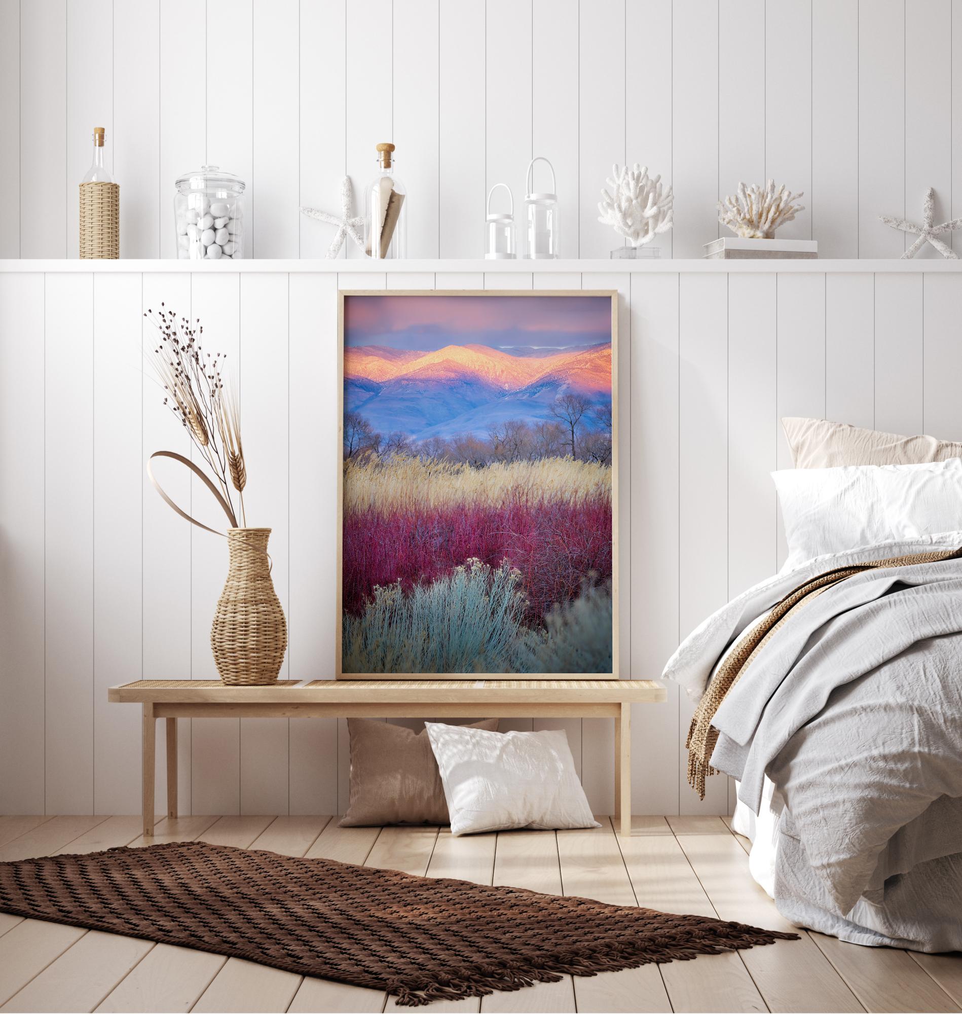 Ein farbenfrohes Poster von Feldern in Schichten, die zu fernen Bergen führen. Eine schillernde Reihe von leuchtenden Farben begrüßt das Auge, die von Grün, Rosa, Gelb, Blau bis Orange reichen. Die Sonne taucht gerade hinter den Bergen in der Ferne auf. Spüren Sie das frühe Morgenlicht und den frischen Tag in diesem Bild.