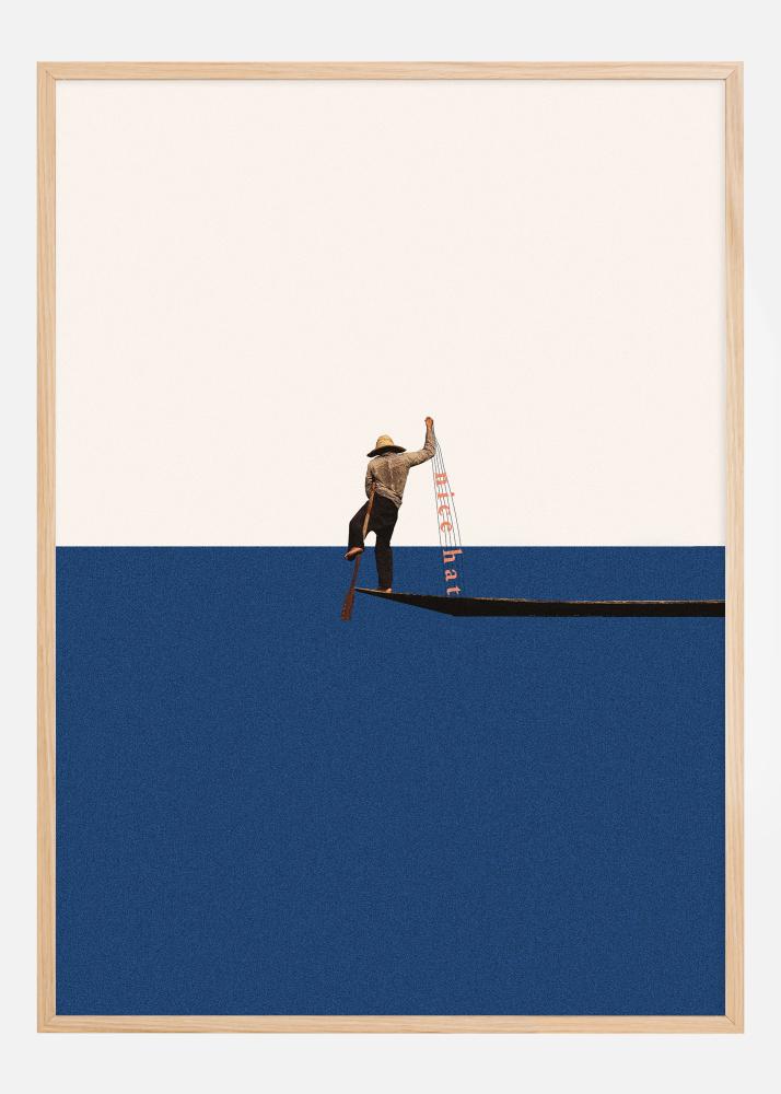 Die Farbpalette ist begrenzt, aber aussagekräftig, mit dem dominierenden Blauton des Wassers, der sowohl an Ruhe als auch Tiefe erinnert. Der hellbeige Hintergrund bietet eine neutrale Leinwand, die es den anderen Farben erlaubt, hervorzutreten. Die kontrastierenden Farben; braun, blau, beige und Akzente von Rot, harmonieren, um eine ausgewogene und ansprechende Ästhetik zu schaffen. Es ist ein Druck, der mehr als nur visuelles Vergnügen bietet; es ist ein Gesprächsstarter, der genauso gut in einem Flur wie in einem Wohnzimmer oder Büro passt.