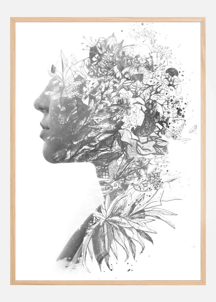 Dieses künstlerische Poster kombiniert das Profil einer Frau mit einer detaillierten und komplizierten Illustration von Blumen und Pflanzen, wodurch eine faszinierende Verschmelzung von menschlicher Gestalt und den fein abgestimmten Details der Natur entsteht. Das schwarz-weiße Farbschema verleiht ein zeitloses Gefühl und hebt die subtile Textur und Komplexität sowohl der menschlichen Figur als auch der floralen Motive hervor.