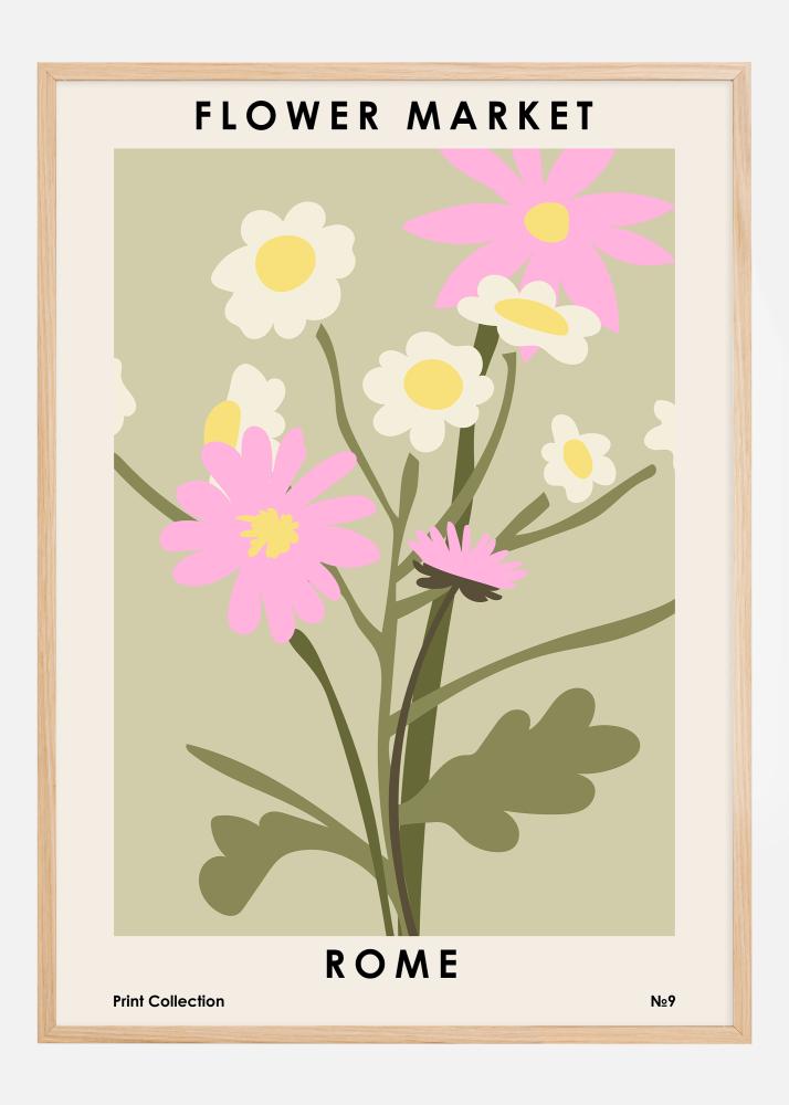 Mit einem hellen und einladenden Design stellt dieses Poster die warme und lebendige Atmosphäre eines Blumenmarktes in Rom dar. Detailreichtum und ein verspielter Einsatz von Farben stehen im Mittelpunkt, mit großen rosa Blumen, die durch zarte weiße Blüten ergänzt werden, alle vor einem beruhigenden olivgrünen Hintergrund. Dieser Druck ist perfekt, um ein Gefühl der ewigen Stadt Rom und ihre Liebe zur Schönheit und Natur in deinen Raum zu bringen.