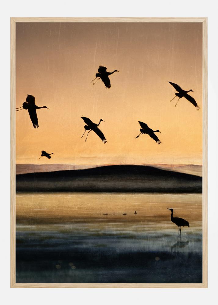 Ein Poster mit Vögeln, die bei Sonnenuntergang fliegen. Sechs Störche fliegen, ihre Silhouetten heben sich deutlich gegen den orangefarbenen Himmel und die untergehende Sonne ab. Ein einsamer Vogel steht im blau-goldenen See und schaut zu den anderen auf, während sie davonfliegen. Spüren Sie den Frieden des Fluges in diesem warmen Poster.