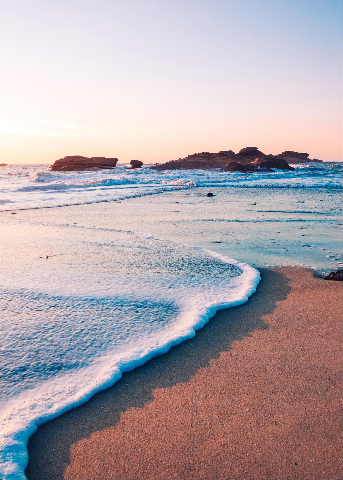 Ein Poster vom Meer mit einem weiten Strand, an dem die Wellen und das Meer an das Ufer schlagen. Sanftes Sonnenlicht wirft die Schatten der Wellen auf den Sand und schafft eine ruhige Umgebung, in der Sie sich sich selbst vorstellen können. Lassen Sie sich in diesem atemberaubenden Poster von Ihren Träumen treiben.