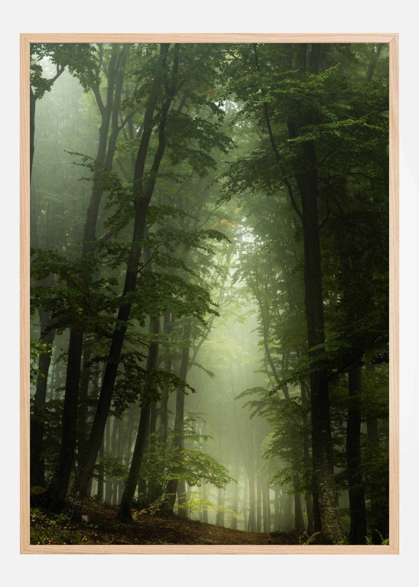 Dieses atmosphärische Poster lädt dich ein, dich in einem von Nebel umhüllten Wald zu verlieren, wo jeder Baum seine eigene Geschichte zu erzählen scheint. Der sanfte Dunst, der die robusten Stämme und das lebendige grüne Laub umschließt, schafft eine traumhafte Szene, die aus einer anderen Welt zu stammen scheint. Das milde Licht, das durch das Laub filtert, verleiht ein Gefühl von Mystik und Ruhe.