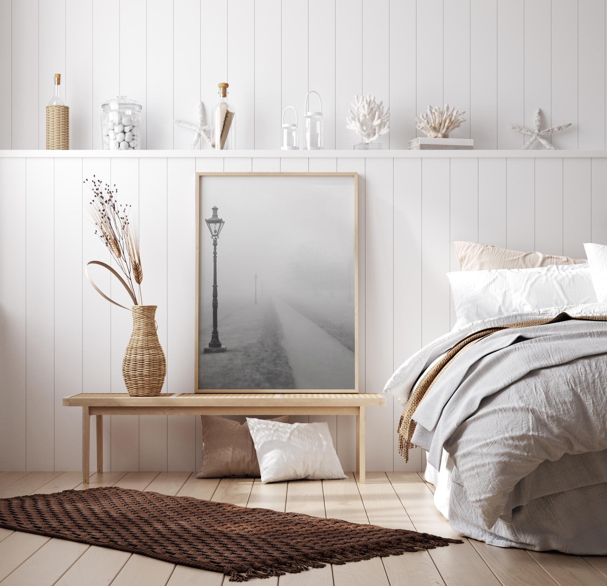 Ein urbanes Poster einer nebligen Straße. Alte Lampen säumen einen einzelnen Weg, der in der Ferne im Nebel verschwindet. Eine unheimliche Ruhe liegt über diesem subtilen Foto, das auch das Element der Winterkälte einbringt. Hängen Sie dieses Foto an eine weiße Wand, um die Stimmung zu erhalten.